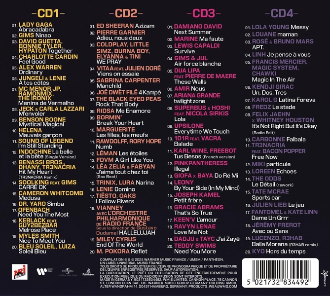 Le rendez-vous musical incontournable : tous les plus grands succès de l'année et les artistes phares de la scène française et internationale sont sur la compilation officielle des NRJ Music Awards 2025. Avec 20 titres dans chaque CD dont : CD1 : Charlotte Cardin - Feel Good Benson Boone - Mystical Magical Blackpink - Jump David Guetta, Hypaton Bonnie Tyler - Together Alex Warren - Ordinary... CD2 : Ed Sheeran - Azizam Gims - Ninao sombr - undressed Teddy Swims - Need You More Ofenbach - Need You The Most Stromae & Pomme - Ma meilleure ennemie... CD3 : Gims & Jul - Air force blanche Bad bunny - DTMF Linkin Park - Up From The Bottom Black eyed Peas - Rock that body Tiesto - I Follow Rivers... CD4 : Justin Bieber - Daisies Pinkpantheress - Illegal Rose & Bruno Mars - APT. Chappell Roan - Pink pony club Tate McRae - Sports car.