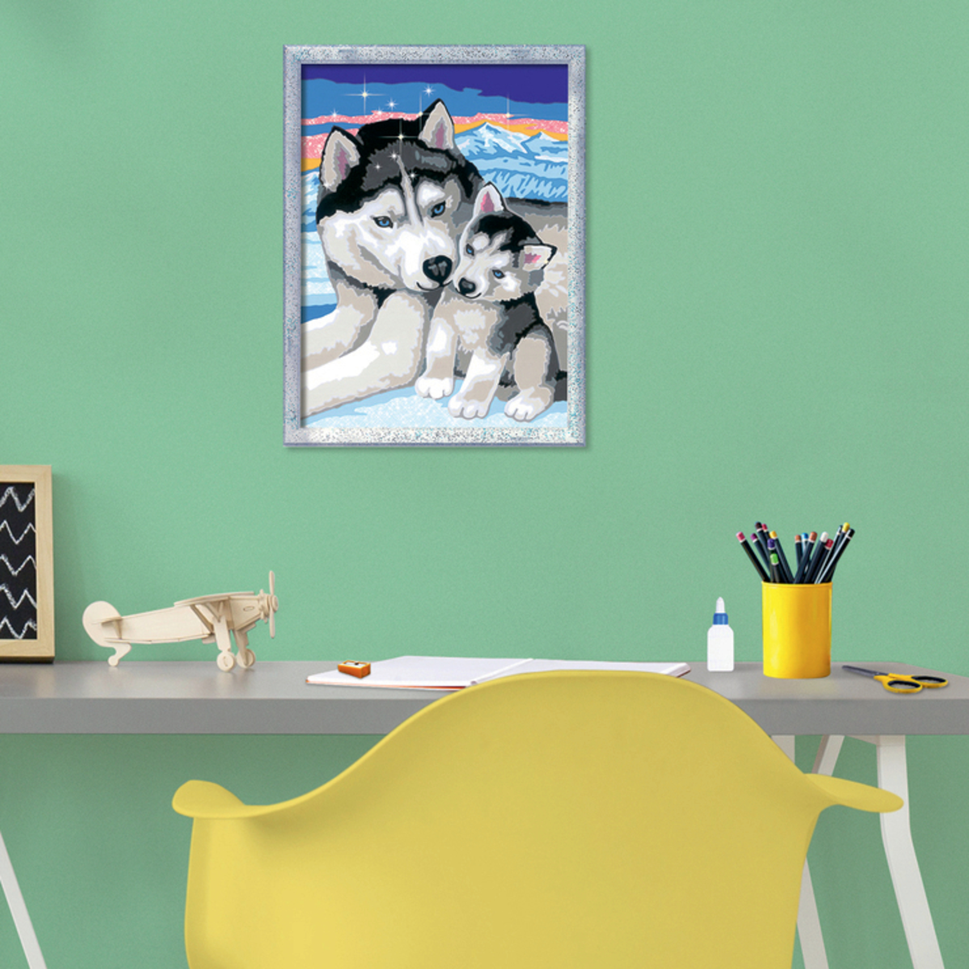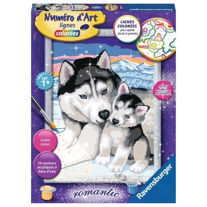 | Plus produit | ACTIVITE CREATIVE MIXTE Ce kit complet moyen format permet aux filles et aux garçons de réaliser cette magnifique maman Husky avec son bébé grâce à la peinture par numéros. Ce tableau scintille avec les paillettes et le cadre brillant inclus. Dès 7 ans. FACILE, BEAU ET AMUSANT Tout le monde peut être un artiste avec la peinture par numéros, même les débutants ! Grâce aux lignes colorées pré-peintes et aux numéros associés à des couleurs, les enfants apprennent à peindre sans dépasser : résultat garanti ! PEINTURES DE QUALITE Les peintures acryliques à base deau et sans odeur ne demandent aucun mélange et sèchent rapidement. Les pots de peinture sont refermables donc réutilisables. La peinture sur les mains, ainsi que sur le pinceau, se nettoient facilement à leau. FAVORISE CONCENTRATION ET AUTONOMIE Loin des écrans, cette activité ludique allie dextérité et précision pour développer l\'habilité manuelle des enfants. Une fois fini, le tableau devient une décoration idéale ou un cadeau unique pour ses proches. KIT COMPLET pour réaliser son chef-d\'oeuvre : 1 tableau de 18x24 cm, 14 pots de peinture acrylique refermables, 1 pinceau, 1 modèle, 2 palettes support de peinture, 1 cadre brillant et des paillettes. Tout est inclus pour réveiller son âme d\'artiste ! |