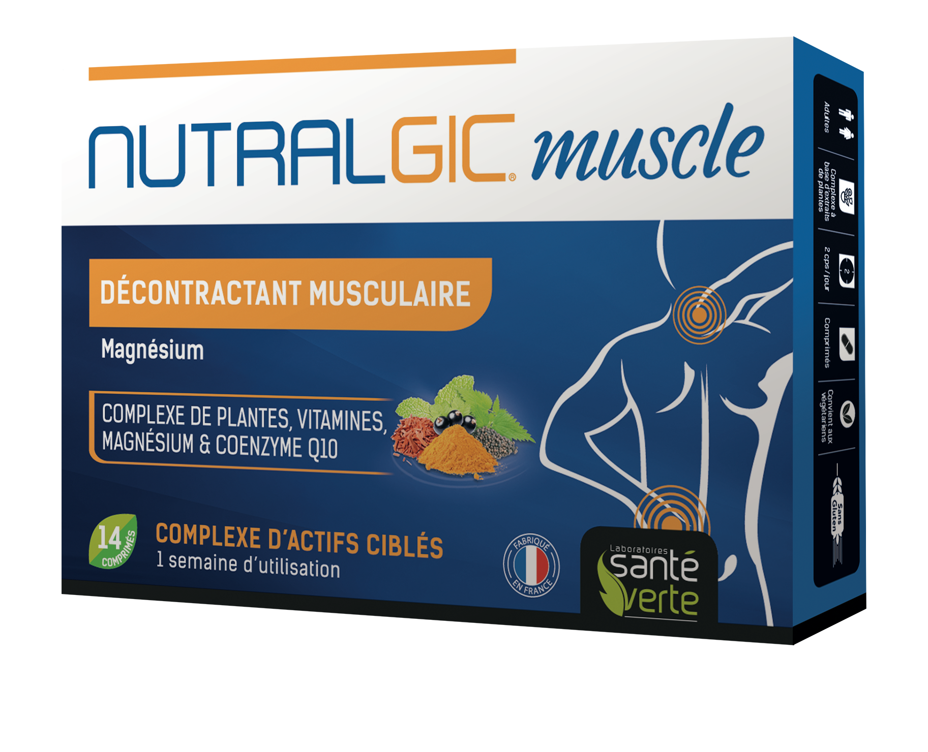 Nutralgic Muscle du Laboratoire Santé Verte est un complément alimentaire qui contient du magnésium et de la vitamine D qui participent au maintien du fonctionnement normal des muscles ainsi que des vitamines B1, B5 et B6 qui contribuent au métabolisme énergétique normal. Cette synergie de composants aide ainsi à maintenir une fonction musculaire normale lors de périodes d'inconfort dû à des crampes. Sa formule est enrichie d'extraits de plantes comme le curcuma, la verveine odorante, le cassis, le quinquina rouge et l'ortie piquante pour une action globale.