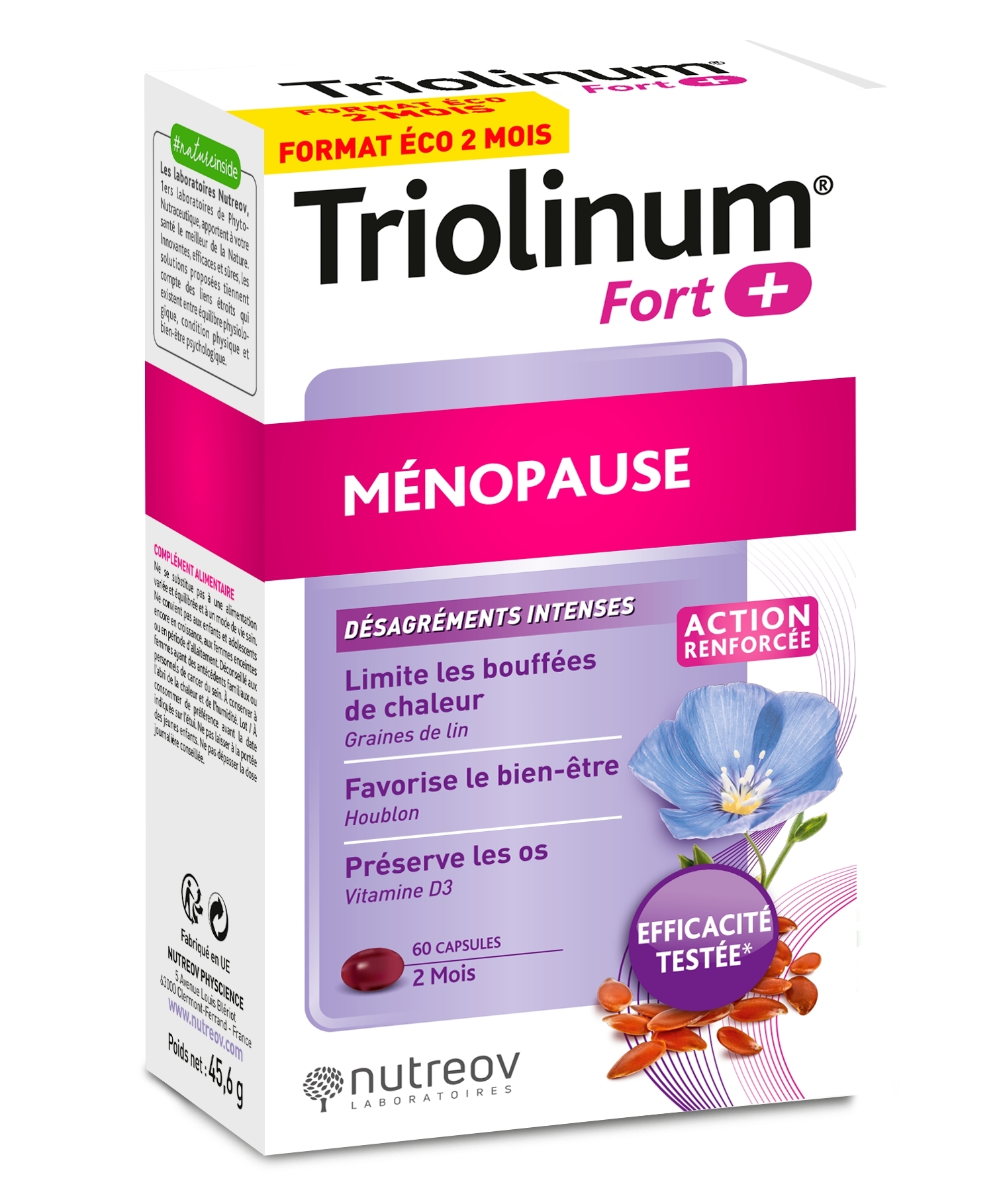 Innovation scientifique des Laboratoires Nutreov Physcience, Triolinum® FORT est formulé pour les femmes ménopausées ressentant les signes liés à cette période. Les lignans (SDG) présents dans l’extrait de graines de lin contribuent au bien-être durant la ménopause. Le houblon aide les femmes à faire face aux signes associés à la ménopause tels que les bouffées de chaleur, la transpiration, l’agitation et l’irritabilité. Il contribue à une détente optimale. Cette formule est renforcée en vitamine D3 qui contribue au maintien d'une ossature normale. Sans isoflavones de soja.