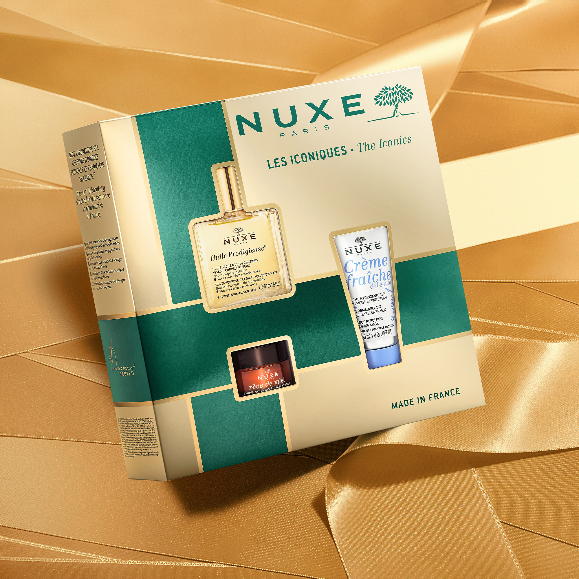 Découvrez les trois soins iconiques de Nuxe pour éveiller vos sens. Ce Coffret Soin Visage contient : -Huile Prodigieuse® 50ml - Crème Fraîche de Beauté® 3-en-1, Crème Hydratante 48H*, Lait Démaquillant, Masque Repulant 30ml - Rêve de Miel Baume Lèvres au Miel Ultra-nourrissant et Réparateur 15gr Soins formulés et fabriqués en France. Coffret 100% carton, 0% plastique et fabriqué en France. *Hydratation 48h : Test instrumental - 10 volontaires Diffusez des ondes de bonheur avec votre playlist par Nuxe : https://open.spotify.com/playlist/2CNPL7lPKl9Jk24EjgVuMB?si=7752f1429f554f94