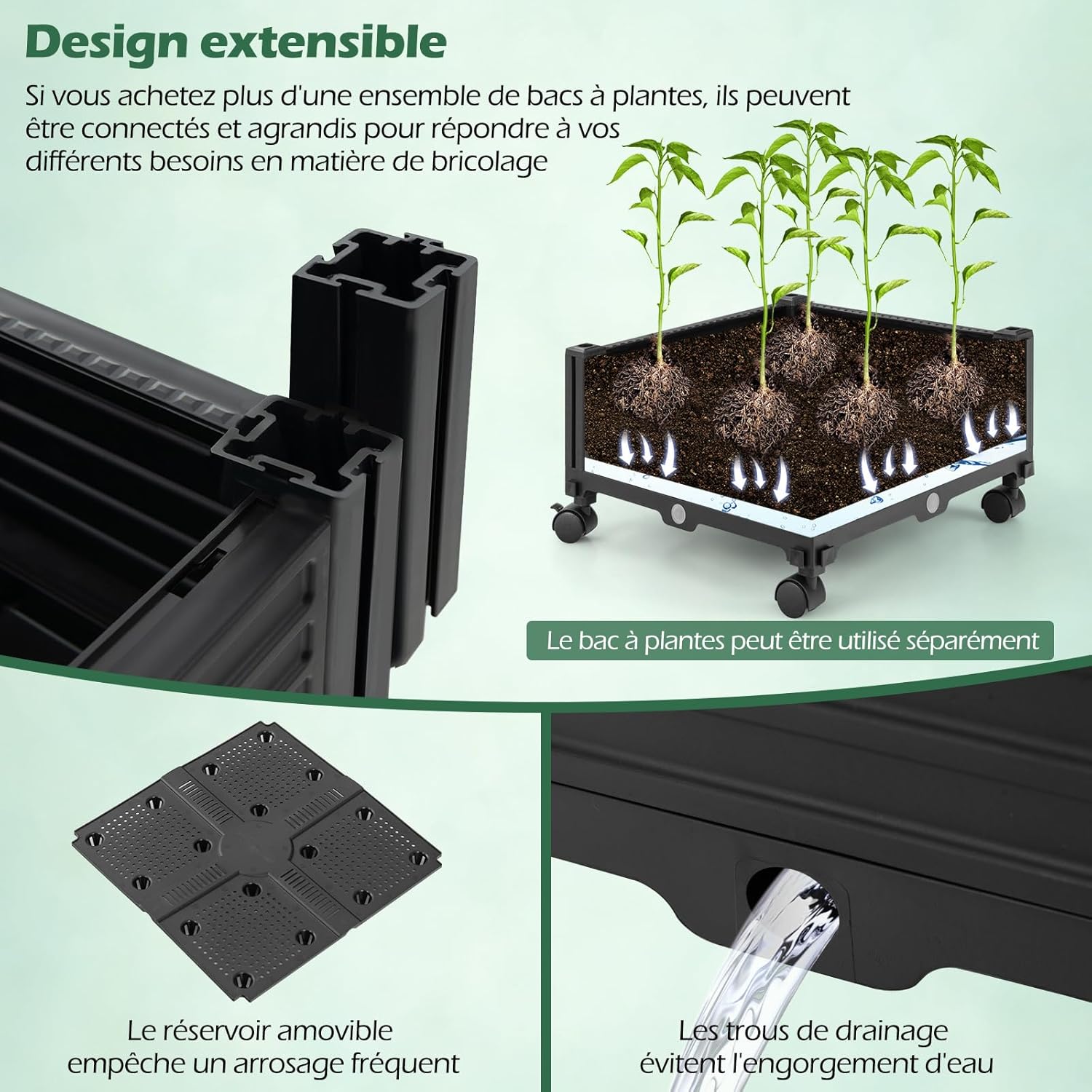 Ce lit de jardin surélevé avec treillis convient aux plantes grimpantes, aux légumes et aux fruits et dispose d’un réservoir de rétention d'eau et des trous de drainage. Fabriqué en tubes métalliques recouverts de PP et de PE, il présente une excellente durabilité. Equipé de 4 roues universelles dont 2 avec freins, il peut se déplacer facilement ou rester en place. Vous pouvez utiliser la jardinière et le treillis ensemble ou séparément, et la conception extensible vous permet d’en connecter plusieurs. Il y a 2 décorations supérieures différentes pour ajouter du charme à la jardinière.
