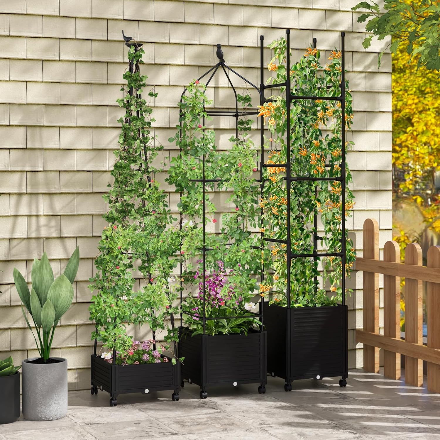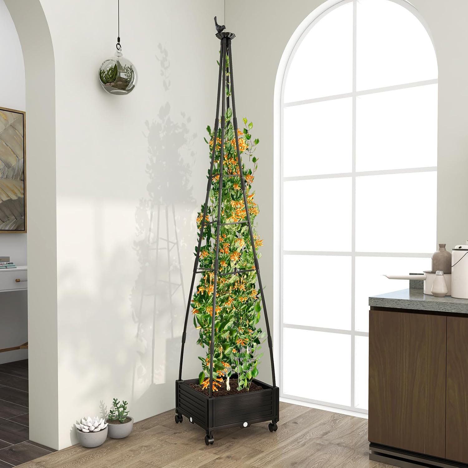 - Conception Mobile et Utilisation Multiple : Doté de 4 roues universelles lisses, dont 2 verrouillables, ce treillis obélisque offre une mobilité et une stabilité faciles en cas de besoin. De plus, la jardinière surélevée convient aux balcons, aux patios ou à l'intérieur, ce qui en fait une option polyvalente pour la croissance des plantes.