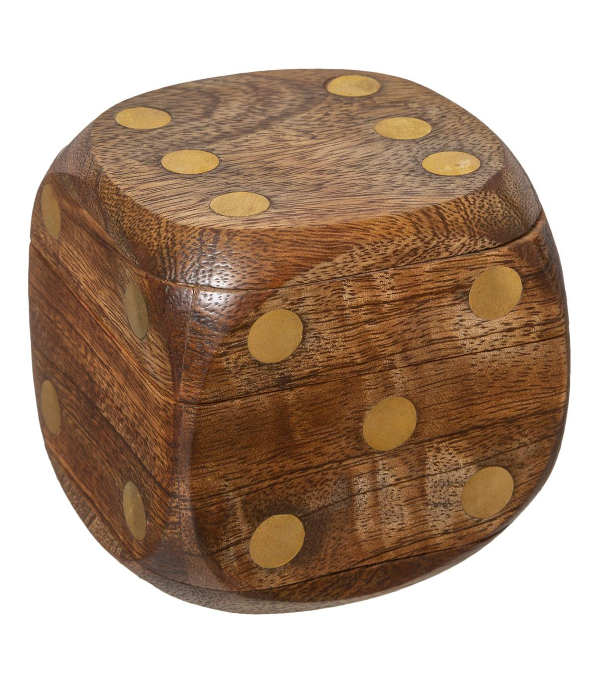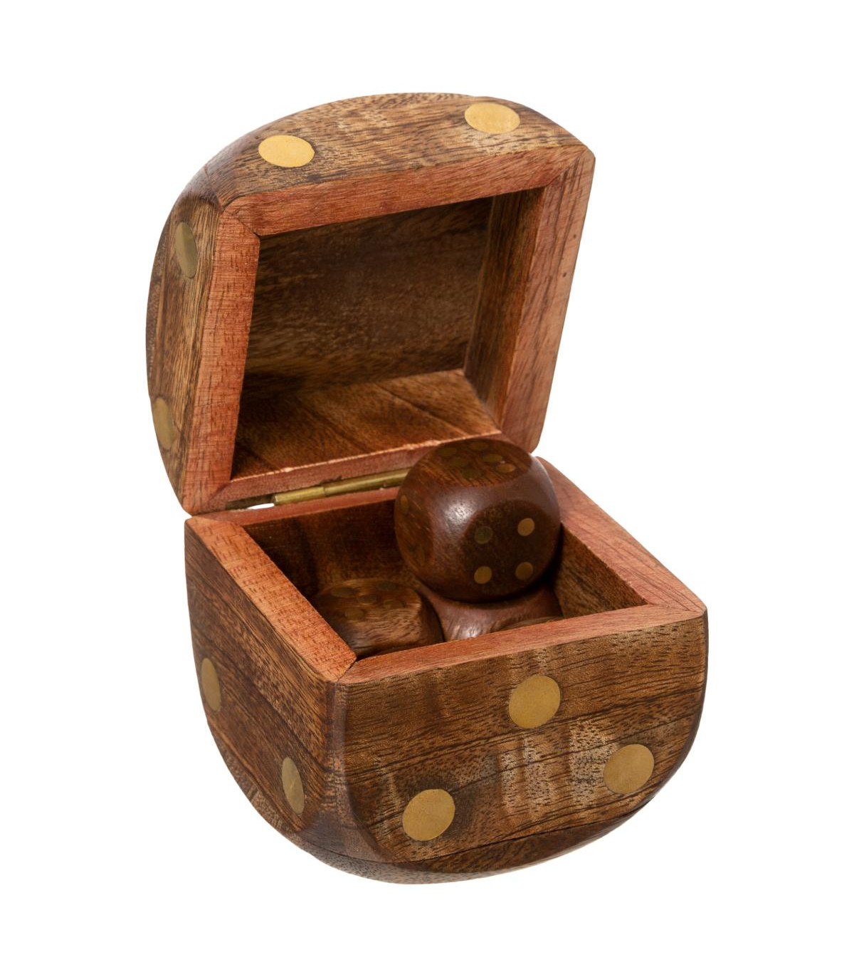 Objet déco Jeu de 5 Dés dans une Boite en forme de Dé en Bois de Manguier et Laiton --