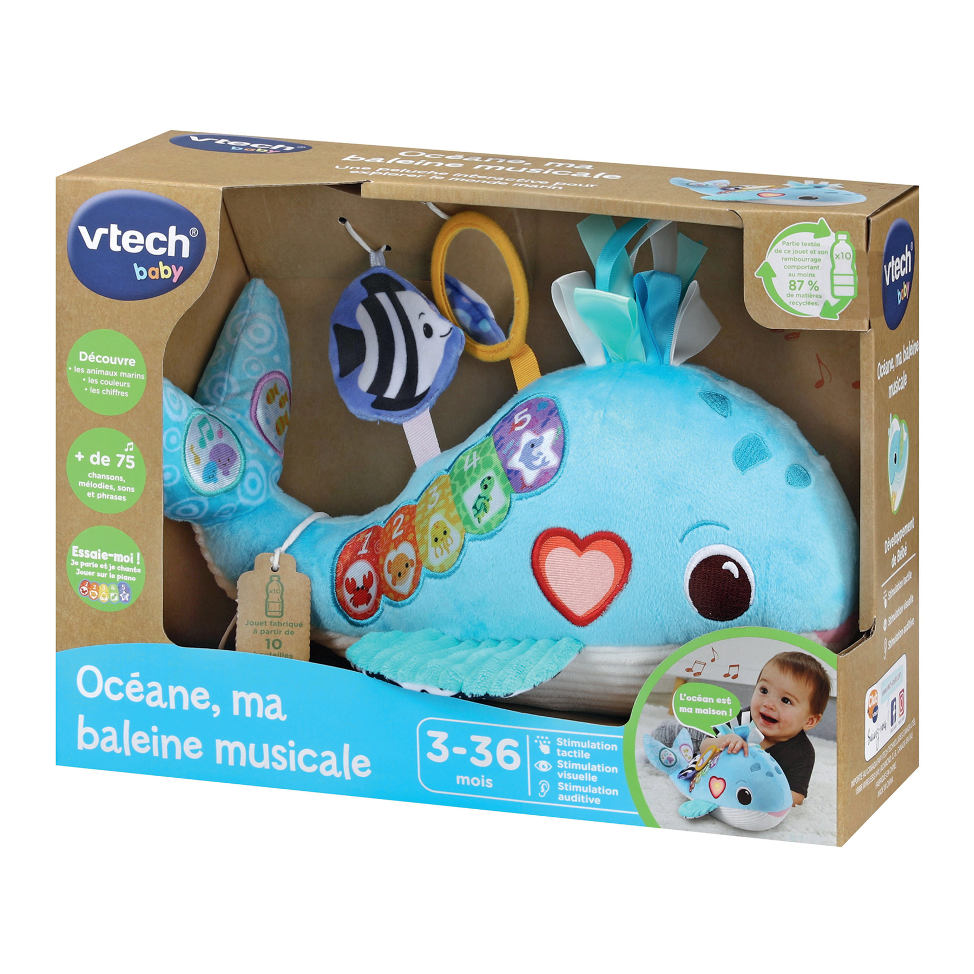 Océane, ma baleine musicale (bouteilles plastiques recyclées) - 3-36 mois Une adorable baleine musicale fabriquée à partir de bouteilles en plastique recyclées ! - 1 bouton Cœur lumineux pour entendre des anecdotes sur la baleine et 2 boutons interactifs pour déclencher des chansons, des mélodies et des sons du monde marin. - 5 touches de piano colorées pour jouer de la musique et apprendre les chiffres, les formes, les couleurs et découvrir les animaux marins. - Différentes matières et textures pour encourager le développement sensoriel de Bébé : papier bruissant, velours, éponge, broderies, rubans et 2 hochets dont un miroir pour que Bébé puisse appréhender son reflet. - Module électronique détachable pour faciliter le lavage de la peluche. 9 chansons, 15 mélodies et de nombreuses phrases pour éveiller Bébé. Tissu fabriqué à partir de bouteilles en plastique recyclé (x10). Réglage du volume sonore et arrêt automatique. Boîte ouverte. Fonctionne avec 2 piles LR03 fournies.