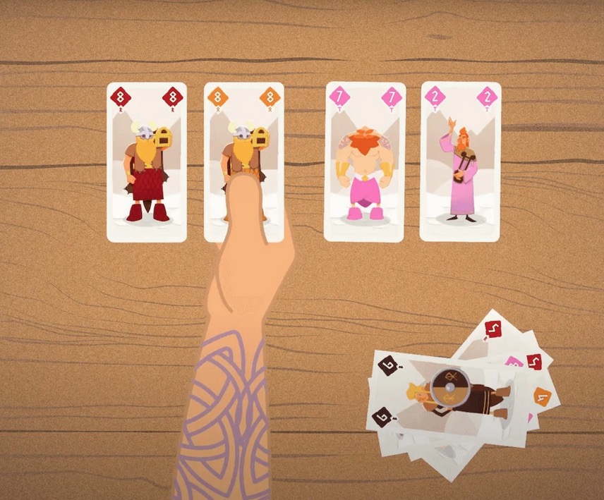 Pour 2 à 6 joueurs A partir de 7 ans Durée : environ 15 mn Envoyez vos meilleurs vikings à la bagarre ! Récupérez les bonnes cartes pour construire votre main et surprendre vos adversaires. But du jeu : Soyez le premier à vous défausser de toutes vos cartes et cumuler le moins de points à la fin de la partie. A votre tour, soit vous JOUEZ une ou plusieurs cartes, soit vous PASSEZ. Si vous jouez, vous devrez : - poser le même nombre de carte ou une de plus que le joueur précédent, mais toujours d'une valeur supérieure. - Si vous posez plusieurs cartes, elles doivent obligatoirement être de même valeur ou de même couleur. - Récupérer une carte présente sur la table. Si vous passez, vous ne posez aucune carte, mais vous pourrez revenir dans le jeu quand le tour reviendra à vous. Le joueur qui pose ses dernières cartes met fin à la manche et ne marque aucun point. Les autres joueurs comptent alors leur nombre de cartes en main, chaque carte vaut 1 point. Le joueur qui a le moins de points quand un joueur atteint 15 points remporte la partie.