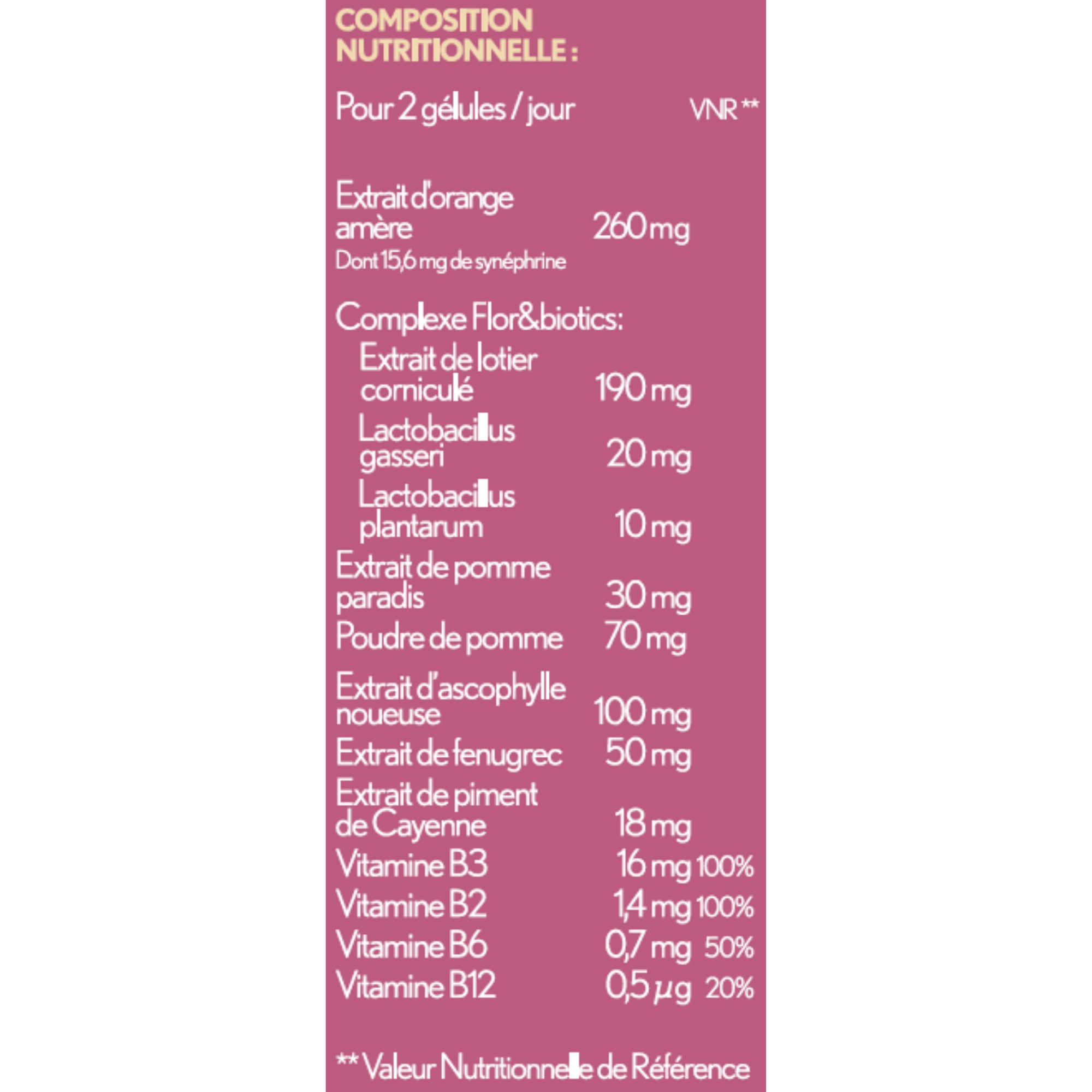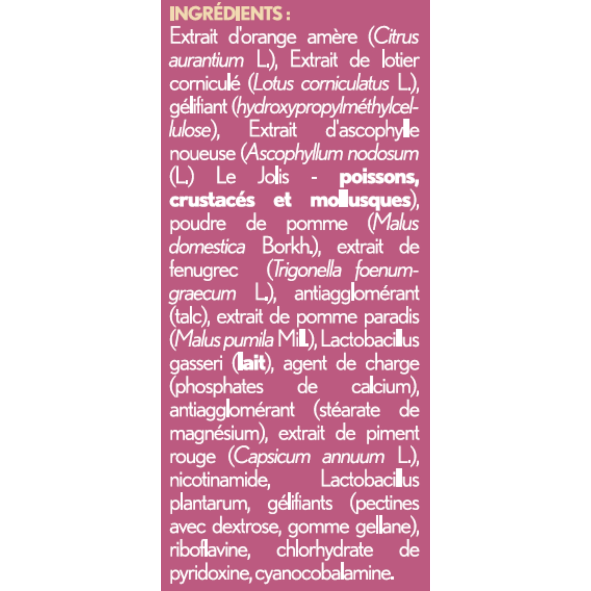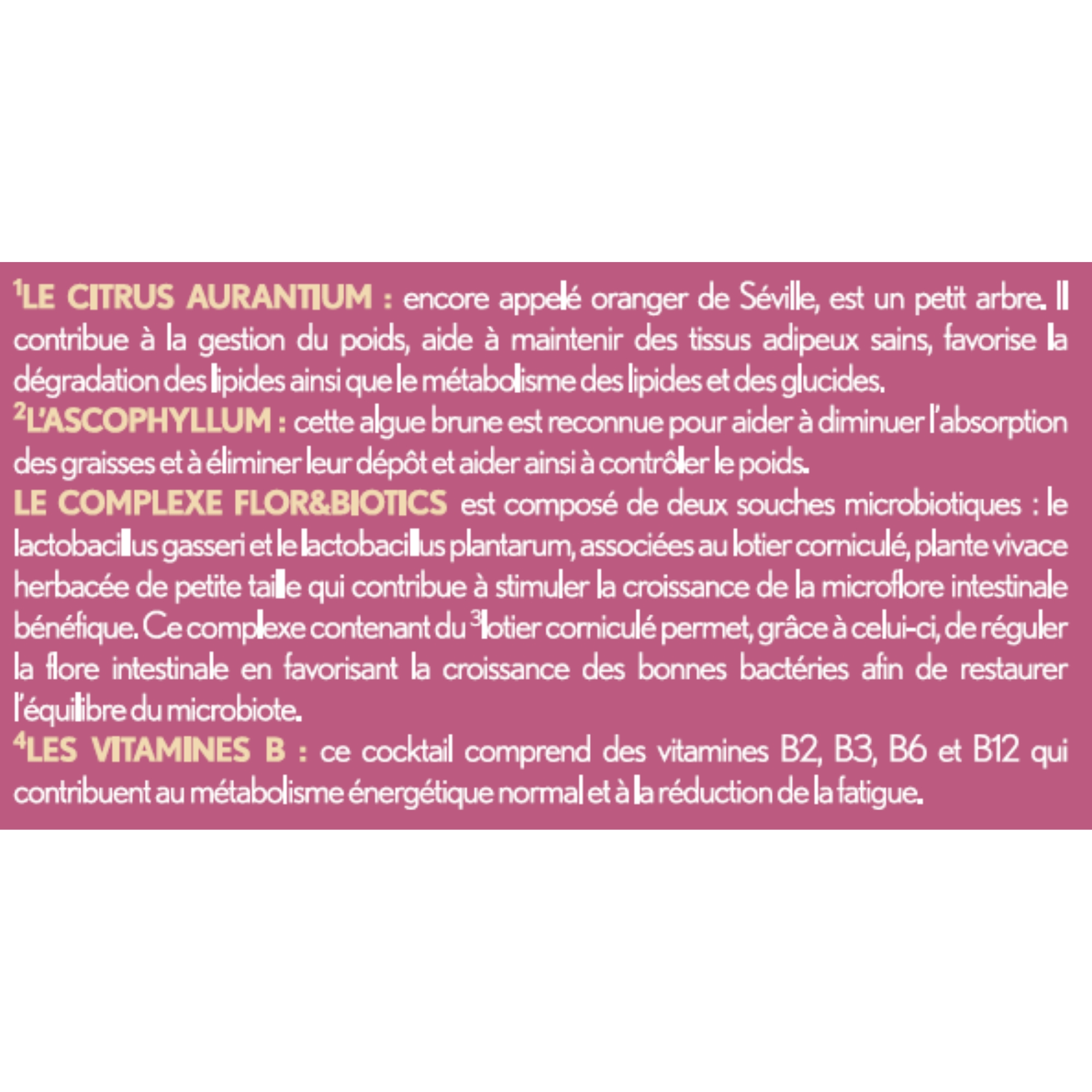 Ingrédients :  (1)Le Citrus Aurantium : encore appelé oranger de Séville, est un petit arbre originaire d’Asie du Sud-Est. Il contribue à la gestion du poids, aide à maintenir des tissus adipeux sains, favorise la dégradation des lipides ainsi que le métabolisme des lipides et des glucides. (2)L’Ascophyllum : cette algue brune est reconnue pour aider à diminuer l’absorption des graisses et à éliminer leur dépôt et aider ainsi à contrôler le poids. Le Complexe Flor&biotics : est composé de deux souches de ferments lactiques : le lactobacillus gasseri et le lactobacillus plantarum qui sont des bactéries lactiques, associées au (3)lotier corniculé, plante vivace herbacée de petite taille qui contribue à stimuler la croissance de la microflore intestinale bénéfique. Ce complexe contenant du lotier corniculé permet, grâce à celui-ci, de réguler la flore intestinale en favorisant la croissance des bonnes bactéries afin de restaurer l’équilibre du microbiote. (4)Les vitamines B : ce cocktail comprend des vitamines B2, B3, B6 et B12 qui contribuent au métabolisme énergétique normal et à la réduction de la fatigue. Extrait d'orange amère (Citrus aurantium L.), Extrait de lotier corniculé (Lotus corniculatus L.), gélifiant (hydroxypropylméthylcellulose), Extrait d'ascophylle noueuse (Ascophyllum nodosum (L.) Le Jolis - poissons, CRUSTACÉS et MOLLUSQUES), poudre de pomme (Malus domestica Borkh.), extrait de fenugrec (Trigonella foenum-graecum L.), antiagglomérant (talc), extrait de pomme paradis (Malus pumila Mill.), Lactobacillus gasseri (LAIT), agent de charge (phosphates de calcium), antiagglomérant (stéarate de magnésium), extrait de piment rouge (Capsicum annuum L.), nicotinamide, Lactobacillus plantarum, gélifiants (pectines avec dextrose, gomme gellane), riboflavine, chlorhydrate de pyridoxine, cyanocobalamine.