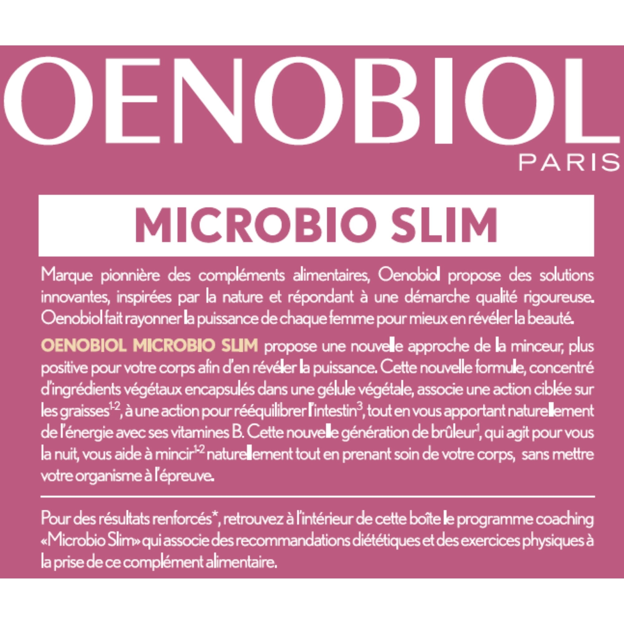 OENOBIOL MICROBIO SLIM PROPOSE UNE NOUVELLE APPROCHE DE LA MINCEUR, PLUS POSITIVE POUR VOTRE CORPS POUR EN REVELER LA PUISSANCE. CETTE NOUVELLE FORMULE, CONCENTRE D’EXTRAITS VEGETAUX ET SOUCHES MICROBIOTIQUES ENCAPSULES DANS UNE CAPSULE VEGETALE, ASSOCIE AINSI UNE ACTION CIBLEE SUR LES GRAISSES(1-2), A UNE ACTION POUR REEQUILIBRER L’INTESTIN(3), TOUT EN VOUS APPORTANT NATURELLEMENT DE L’ENERGIE AVEC SES VITAMINES B(4). CETTE NOUVELLE GENERATION DE BRULEUR(1), QUI AGIT POUR VOUS LA NUIT, VOUS AIDE A MINCIR(1) NATURELLEMENT TOUT EN PRENANT SOIN DE VOTRE CORPS, SANS METTRE VOTRE ORGANISME A L’EPREUVE. (1) LE CITRUS AURANTIUM CONTRIBUE A LA GESTION DU POIDS, AIDE A MAINTENIR DES TISSUS ADIPEUX SAINS, FAVORISE LA DEGRADATION DES LIPIDES AINSI QUE LE METABOLISME DES LIPIDES ET DES GLUCIDES. (2) L’ASCOPHYLLUM : AIDE A DIMINUER L’ABSORPTION DES GRAISSES ET A ELIMINER LEUR DEPOT ET AIDE AINSI A CONTROLER LE POIDS. (3) LE LOTIER CORNICULE CONTRIBUE A STIMULER LA CROISSANCE DE LA MICROFLORE INTESTINALE BENEFIQUE. (4) LES VITAMINES B2, B3, B6 ET B12 CONTRIBUENT AU METABOLISME ENERGETIQUE NORMAL ET A LA REDUCTION DE LA FATIGUE.