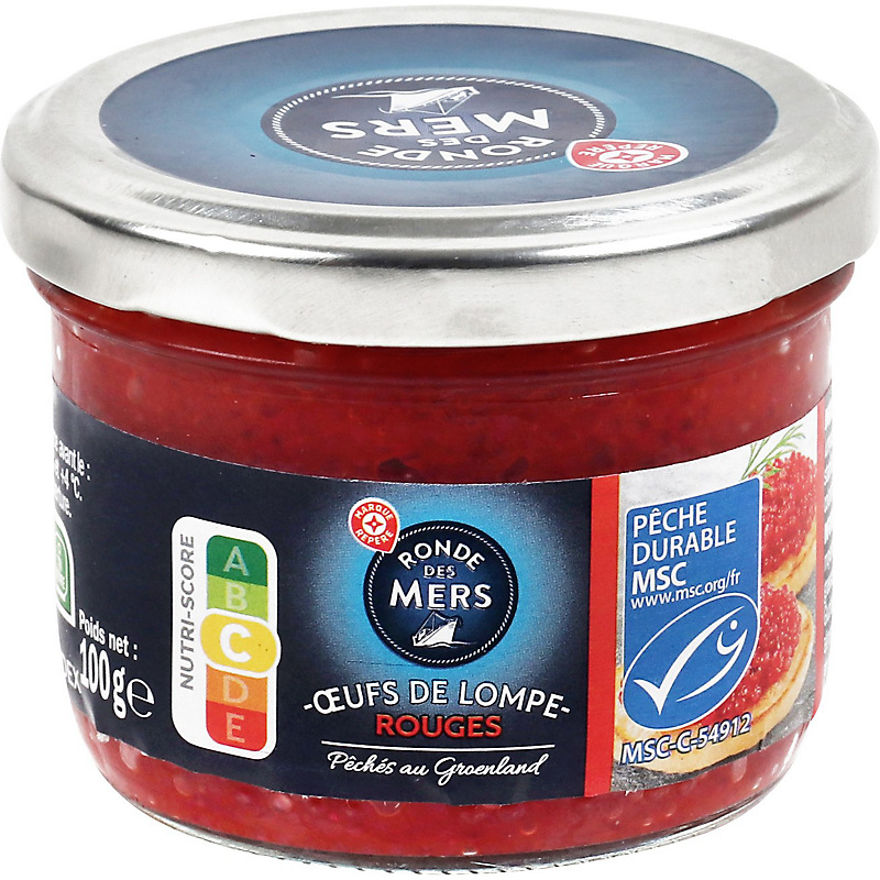 Ingrédients : Œufs de lompe salés 84 % (œufs de lompe (poisson) 80 % (Cyclopterus lumpus pêché en Atlantique Nord-Ouest) ; sel ; antioxydant : extrait de romarin) ; eau ; stabilisants : glycérol, gomme xanthane ; extrait de carthame ; colorants : E 120, extrait de paprika.