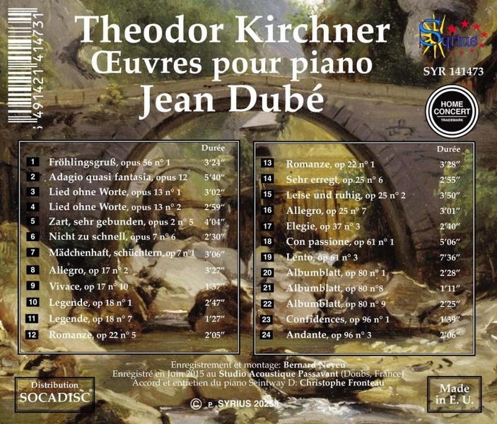 Fürchtegott Theodor Kirchner, né le 10 décembre 1823 à Neukirchen, près de Chemnitz, et mort à Hambourg le 18 septembre 1903, fut compositeur, chef d'orchestre, organiste et pianiste allemand de la période romantique, auteur de nombreuses oeuvres pour piano, orgue, et musique de chambre. Ses oeuvres comportent plus de cent numéros d'opus, principalement des pièces pour piano (plus d'un millier) mais aussi des trios et duos et de nombreuses transcriptions, quelques pièces d'orgue et de chant choral. Sa musique, très personnelle, reflète généralement une atmosphère dramatique et tourmentée, sans toutefois tomber dans le lyrisme. Les dissonnances et les chromatismes y sont fréquents. Il a transcrit Beethoven, Mendelssohn, Schumann et Haydn. Interprète hors pair des oeuvres de Schumann et Liszt, ceuxci le tenaient en haute estime, de même que Richard Wagner. Sa musique, qui se situe quelque part entre Schumann et Brahms, se révèle assez personnelle.