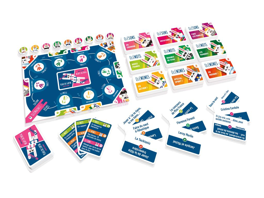 La boîte contient 1 plateau de jeu, 9 pions, 558 cartes et 1106 mots à faire deviner, 42 cartes gages.