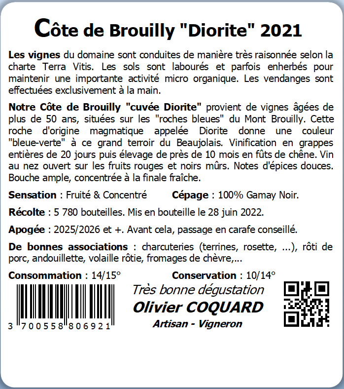 | Libellé | Olivier Coquard Diorite, 2023 - Côte de Brouilly AOP - Rouge - 75 cl |