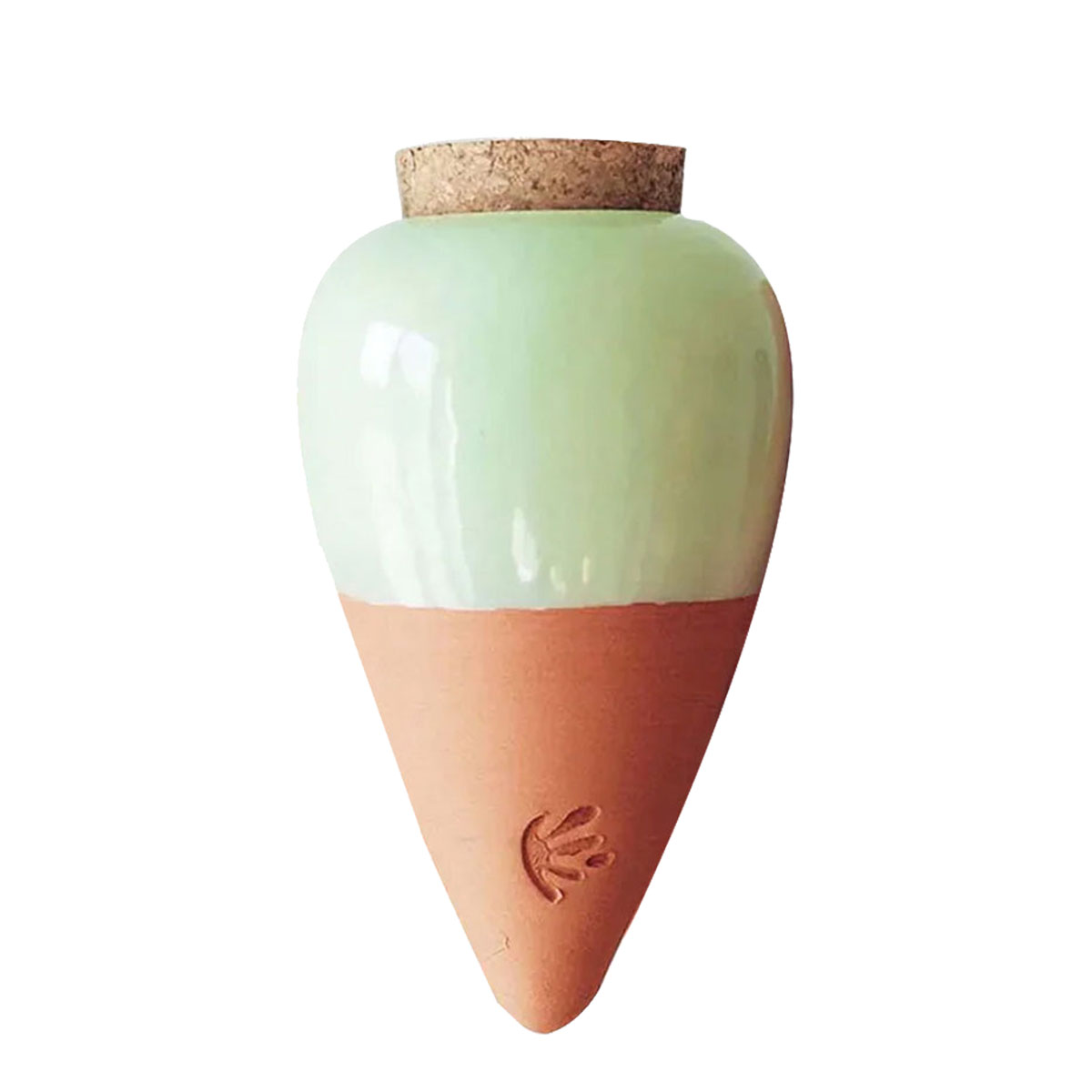 Olla Pépin en terre cuite finition vert pastel Fabriquée en Espagne Fabrication artisanale Bouchon en liège Réservoir d'eau naturel à insérer le long des plantes, l'Olla Pépin diffuse de manière progressive et autonome l'eau qu'elle contient pour un arrosage simple et écologique Hauteur 15.5 cm - Diamètre 8 cm