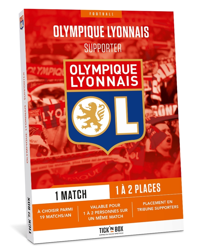 Qui ne saute pas n’est pas Lyonnais ! Découvrez l’ambiance du Groupama Stadium au plus près des supporters lyonnais dans les virages du stade. Avec Tickn'Box, assistez au match de votre choix parmi toutes les rencontres à domicile (hors matchs de coupes) Dans votre Tickn'Box, vous découvrirez : Un chèque cadeau échangeable contre 1 ou 2 places selon le match choisi. Ce chèque permet de réserver le match de votre choix en vous connectant sur le site tickandbox.net et d’imprimer vos places directement Le coffret est valable pour 1 ou 2 places, 24 mois à compter de sa date d’achat. Tickn'Box est revendeur officiel de l'Olympique Lyonnais. Choisissez votre rencontre et vivez une expérience unique.