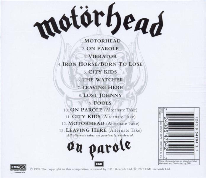 \"On Parole\" de Motorhead dans une version entièrement remasterisée. Édition économique du premier album ravageur enregistré en 1975... le rock n' roll ne savait pas ce qui lui arrivait ! Comprend 4 prises alternatives. Le membre fondateur Lucas Fox, batteur du line-up original, a également écrit de nouvelles notes de pochette, qui contiennent également des photos et des documents d'archives rarement vus. La sortie est complétée par une version rare de la pochette, auparavant disponible uniquement au Canada, et est le seul album de Motorhead à réunir tous les membres fondateurs (Lemmy au chant et bassiste, Larry Wallis en tant que guitariste et chanteur, Lucas Fox à la batterie. ).