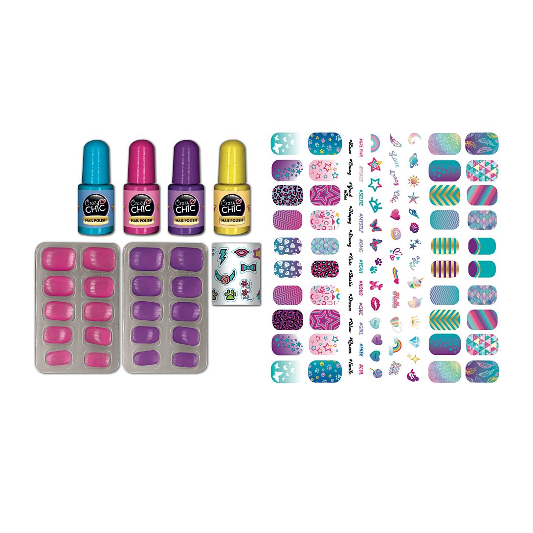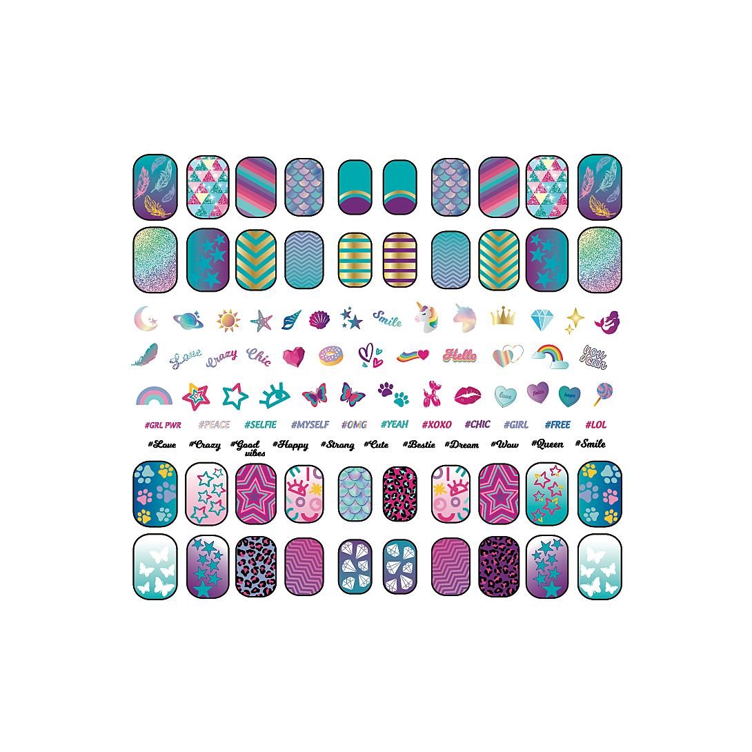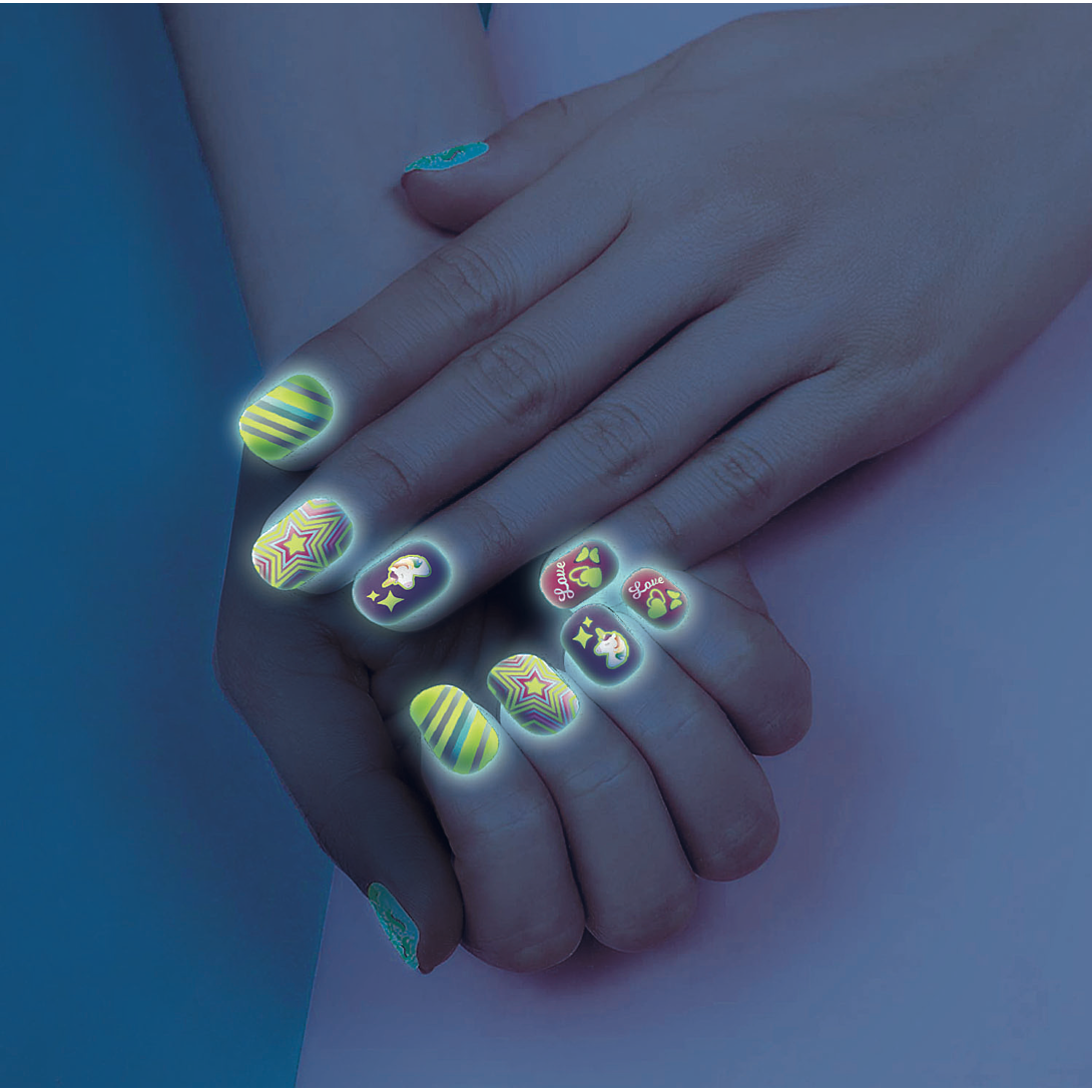 • Tes ongles n’ont jamais été aussi fluo et lumineux, même dans le noir ! • Tout le nécessaire pour une onglerie parfaite, avec des vernis colorés, des faux ongles et des autocollants. • Les décors transferts créent un effet phosphorescent spécial, pour des ongles aux couleurs éclatantes qui s’illuminent dans l’obscurité, parfaits en toutes circonstances ! • Les autocollants sont faciles à appliquer sur les ongles, pour un look unique et personnalisé à arborer jour et nuit ! • Un jeu qui stimule la créativité dans l’univers de la beauté.