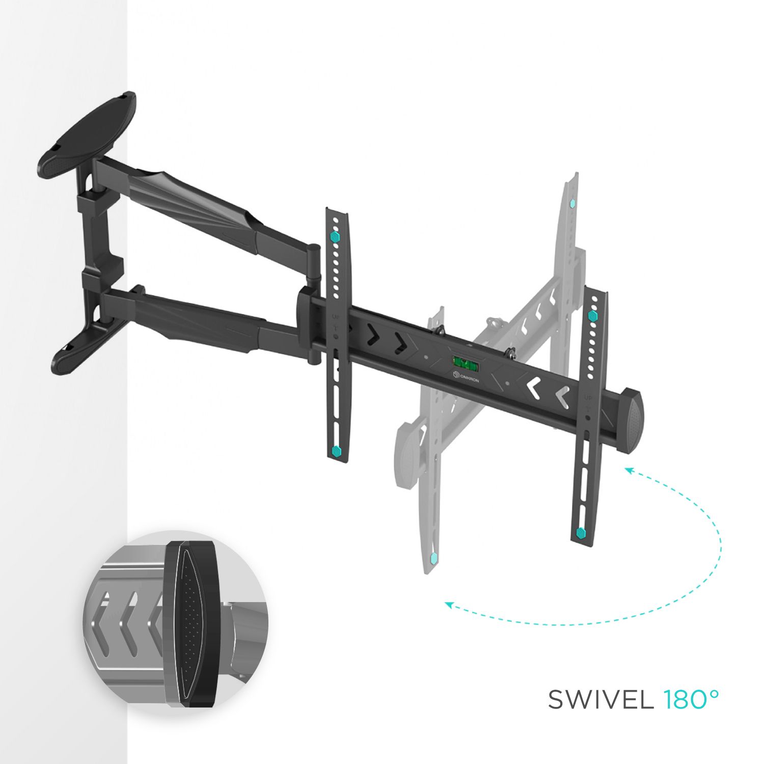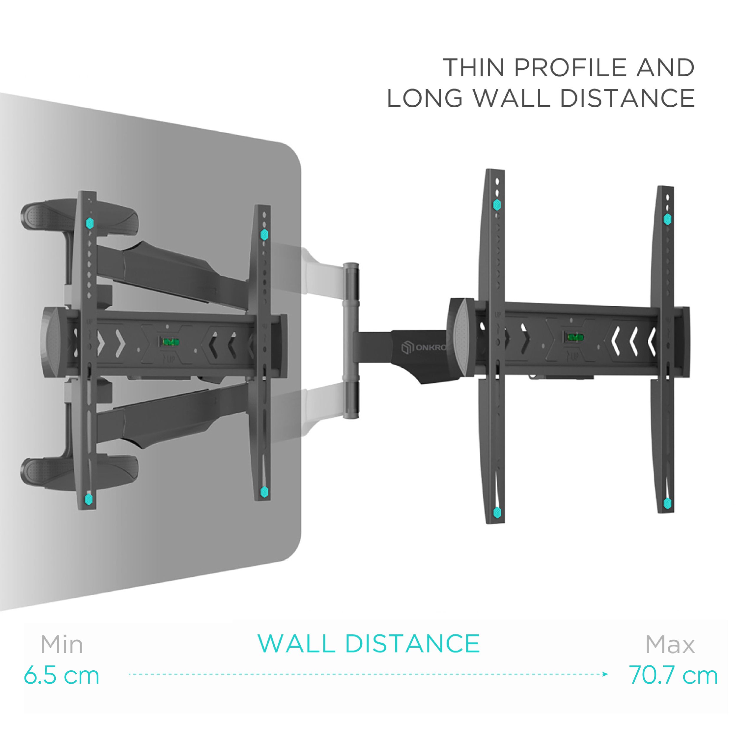 SUPPORT TELE MURAL | Support mural TV inclinable de -5°~+8° | Accroche TV mural pivotant jusqu'à 180° | Portée entre le mur et le support mural TV bras articulé long est réglable de 65 à 707 mm | Fixation tele murale a un niveau à bulle intégré pour l'installation du porte tele tout droit | Notre bras articulé TV mural est idéal pour la maison & petites entreprises