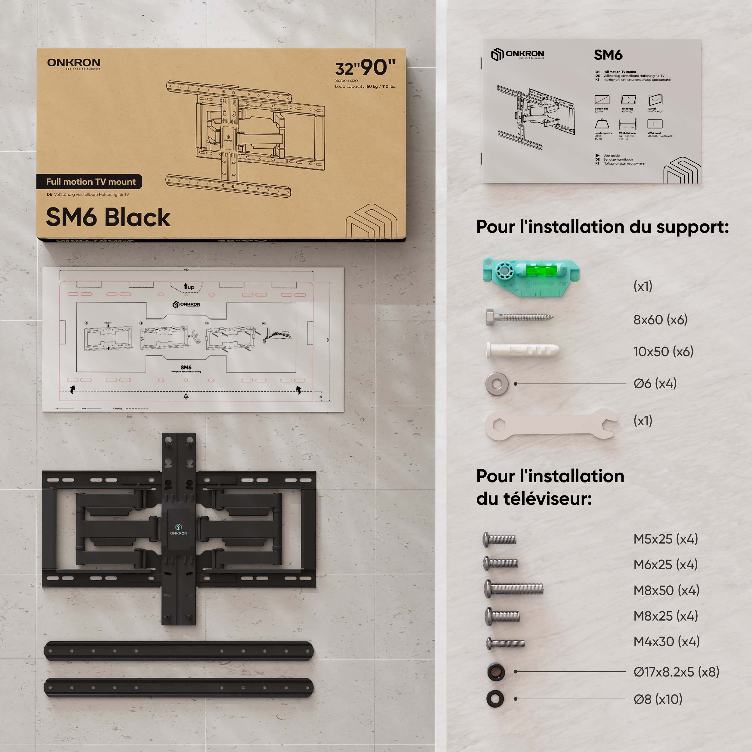 BRAS TELEVISION MURALONKRON SM6 est un support mural TV 32 pouces - 90 pouces pour les TVs d'une diagonale de 32 à 90 pouces | Bras articulé TV mural peut tenir un poids jusqu'à 50 kg | Accroche murale TV est compatible avec VESA 200x200 - VESA 600x400 | Bras support TV est possible de l'installer dans une niche