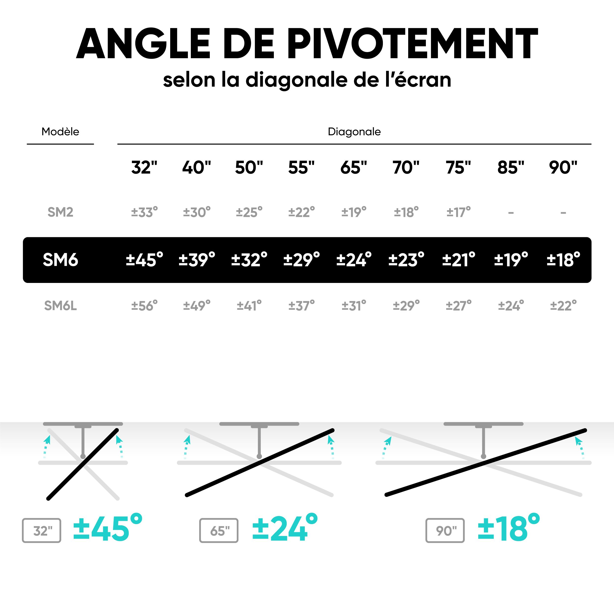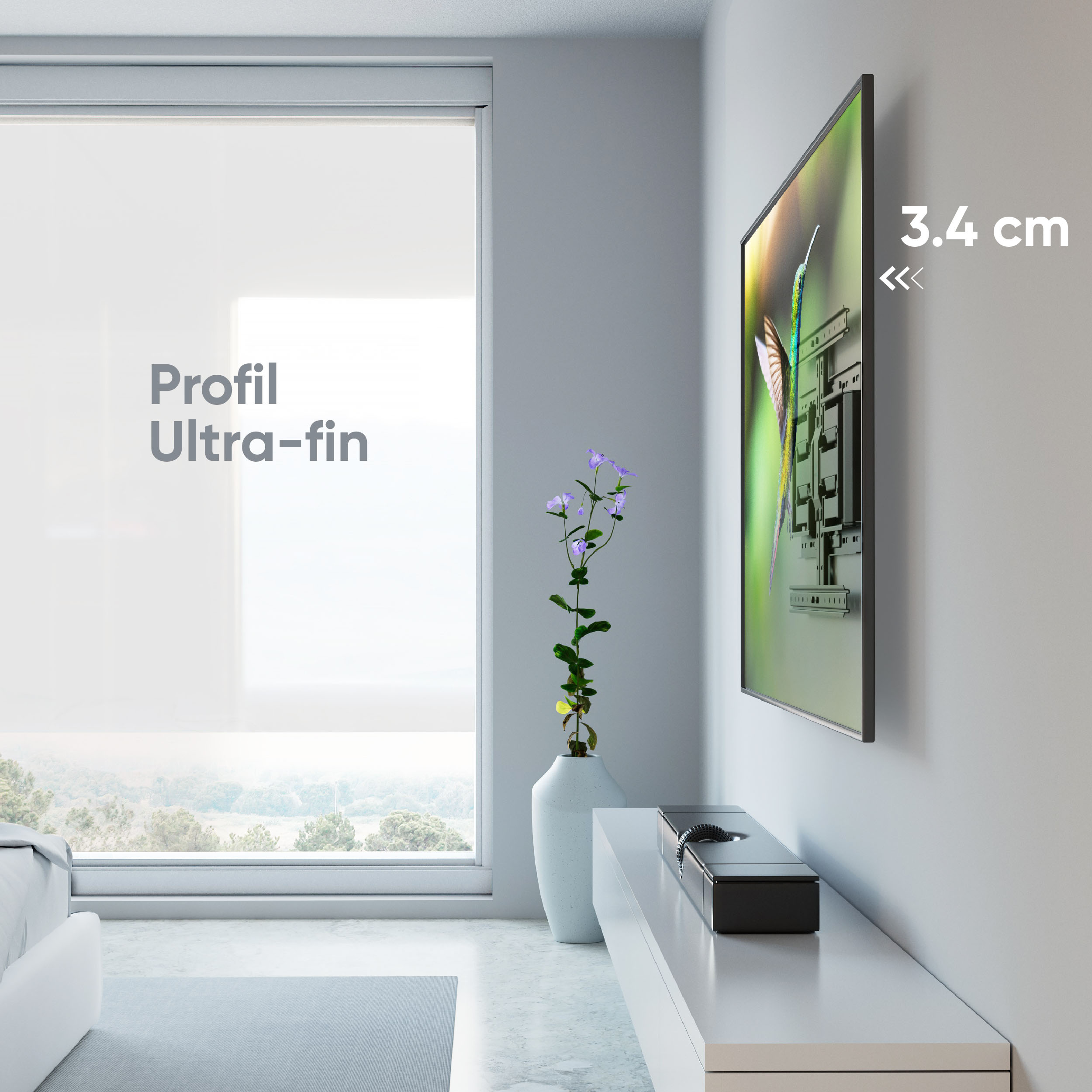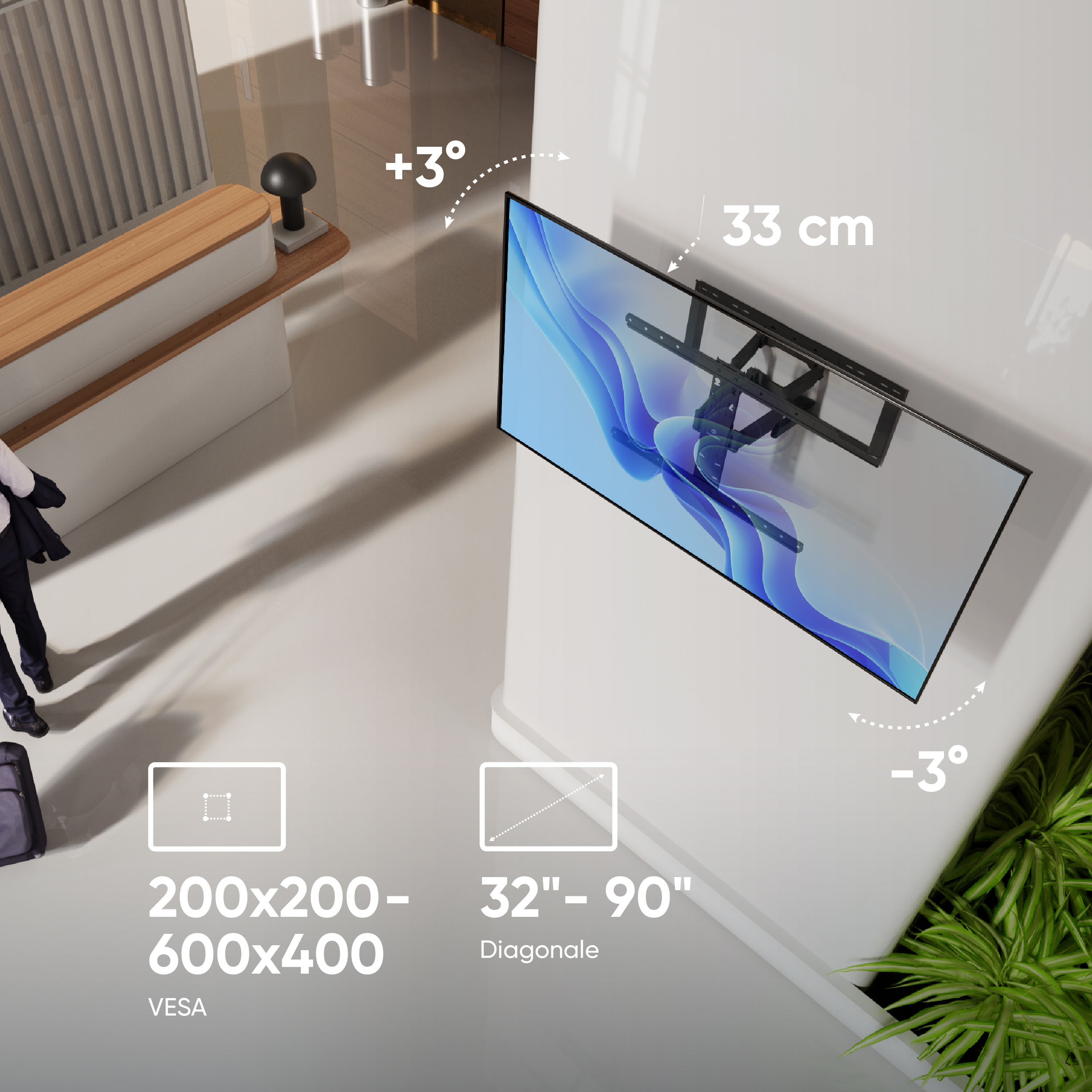 FIXATION TV MURALESupport mural TV inclinable de +5° à -10° | Accroche TV mural pivotant à gauche et à droite de 80° | Support TV mural orientable en horizontal de -3° à +3° | Portée entre le mur et le support tele mural pivotant est réglable de 3,4 à 33 cm | Fixation television murale est idéale pour utiliser à la maison, au bureau ou dans un espace public