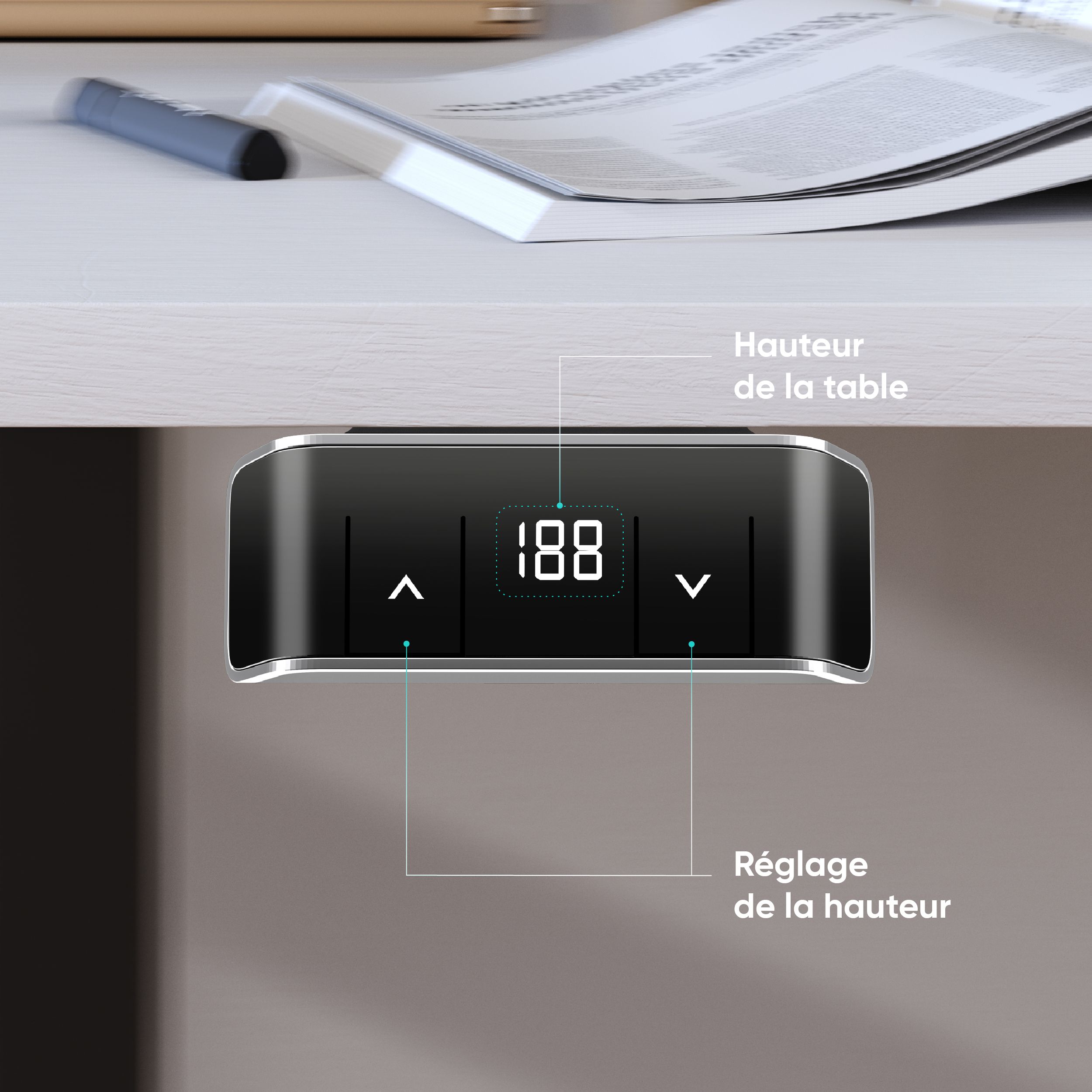 BUREAU ASSIS DEBOUT ÉLECTRIQUE | Hauteur du pied bureau electrique se modifie en maintenant le bouton enfoncé | Écran digital sur le bureau electrique assis debout affiche la distance entre le plateau et le sol ainsi que les messages de service | Profitez de la simplicité d’utilisation de notre high tech bureau & table assis debout electrique!