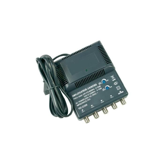 OPTEX 051009 Amplificateur intérieur blindé 4 sorties - Compatible avec la TNT - Améliore les signaux d'antennes faibles et compense les pertes dues a de grandes longueurs de câbles - Amplification UHF de 10 a 25 dB et VHF de 0 a 15 dB - Connexions : fiche F - Tension d'alimentation : 230 V AC - Noir