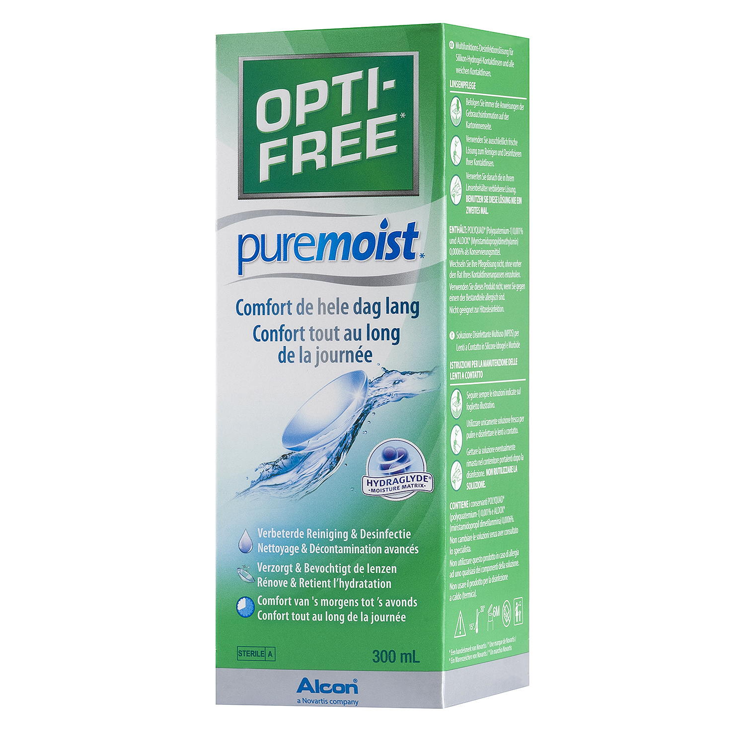 OPTI-FREE PureMoist vous procure 16 heures d'hydratation des lentilles de la pose de vos lentilles jusqu'à la fin de votre journée. Vous pouvez alors porter vos lentilles de contact en toute confiance. Des composants protéiques et lipidiques provenant des larmes peuvent s'accumuler sur vos lentilles de contact, causant des irritations et pouvant même troubler votre vision. Opti-free se fixe sur vos lentilles pour éliminer les dépôts lipidiques et protéiques et prévenir les dépôts lipidiques. Grâce à cette technologie de pointe qui élimine tous ces dépôts, vos lentilles restent ainsi propres et confortables. En plus d'offrir 16 heures d'hydratation et d'éliminer les dépôts, cette solution contient également une formule de décontamination renforcée. Le double système de décontamination POLYQUAD et ALDOXagit contre les micro-organismes nuisibles tels que les bactéries, les champignons et Acanthamoeba. Ces composants sont reconnus pour être efficaces pour toutes les lentilles de contact souples et en silicone hydrogel. Cette formulation efficace reste douce pour les yeux sensibles.