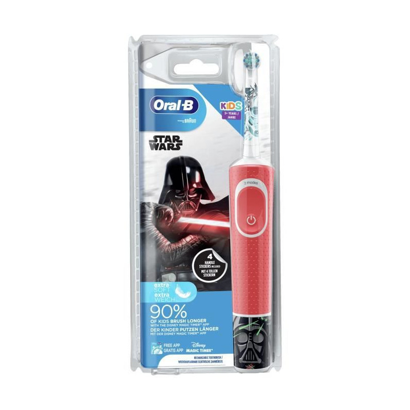 La brosse a dents électrique Oral-B Kids, adaptée a partir de 3 ans, offre le nettoyage doux et efficace d'une brosse a dents Oral-B. Avec un mode sensible unique adapté aux enfants, cette brosse nettoie en douceur les dents des enfants. Elle élimine plus de plaque dentaire. 4 autocollants inclus pour personnaliser le manche