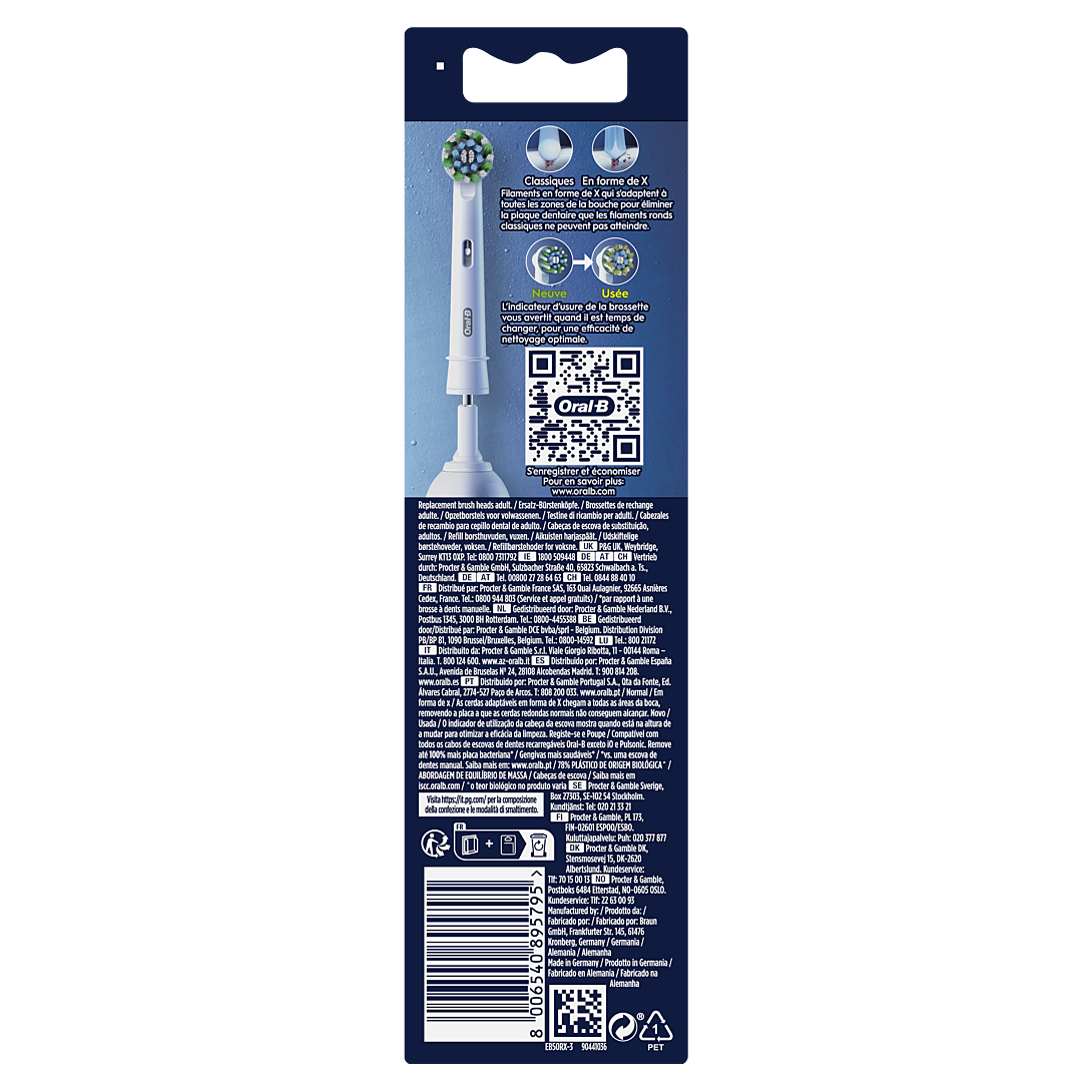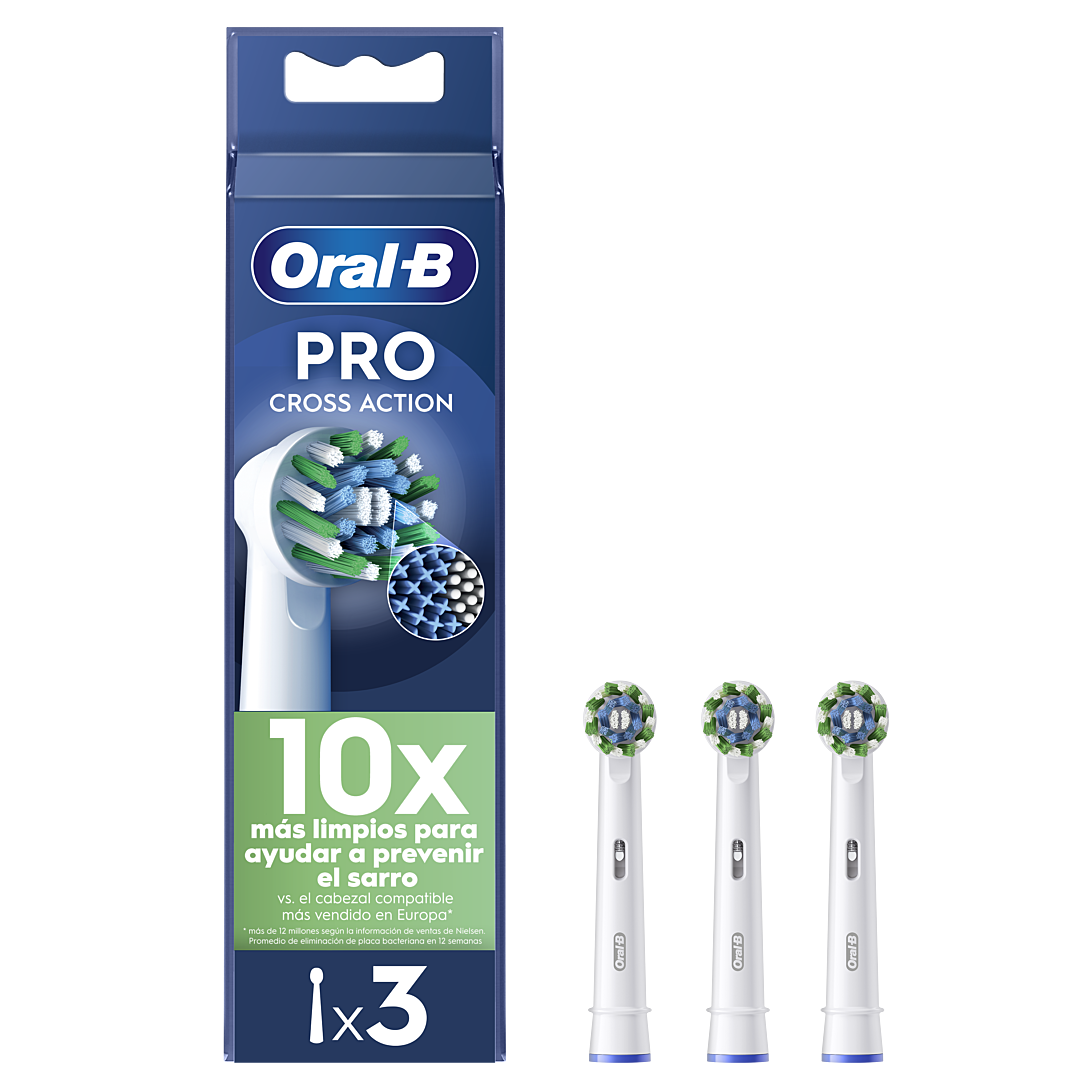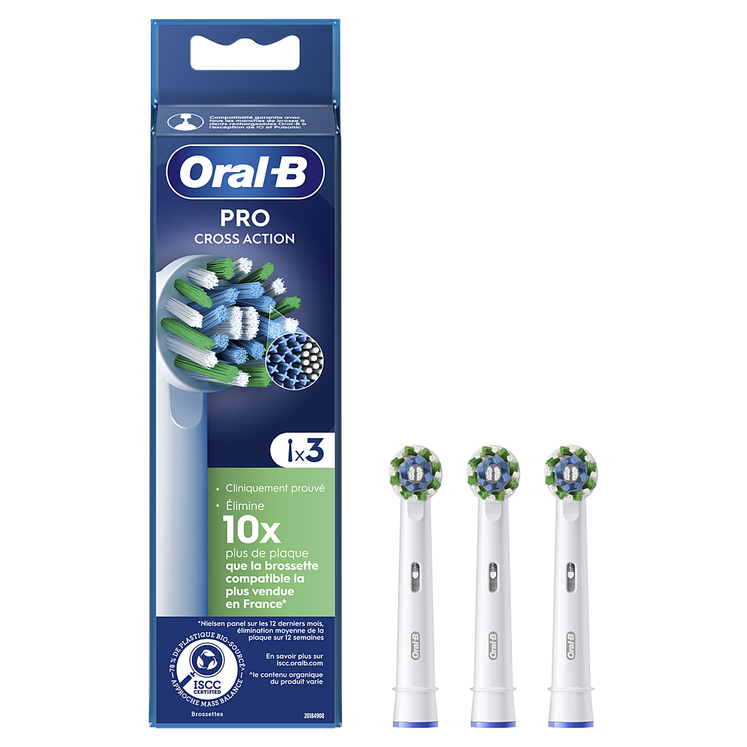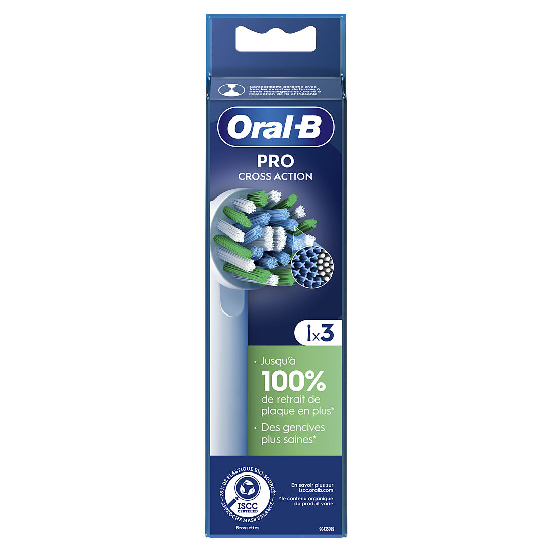 Oral-B Pro Cross Action est dotée de plus de 2 200 filaments obliques pour éliminer jusqu'à 100 % de plaque bactérienne pour des dents plus propres et des gencives plus saines qu'avec une brosse à dents manuelle. Les brossettes Oral-B authentiques sont dotées de nouveaux filaments en forme de X qui nettoient les zones inaccessibles aux filaments arrondis. Les filaments passent du vert au jaune vous rappelant de changer de brossette pour conserver une efficacité de nettoyage optimale. Compatibilité garantie avec toutes les brosses à dents électriques rechargeables Oral-B à l'exception des brosses à dents Pulsonic et iO.