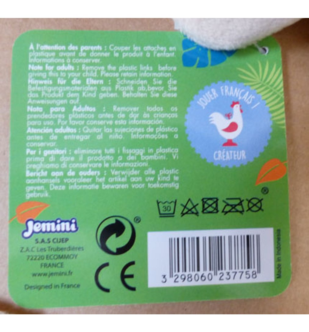 | Avertissements | À l’attention des parents: Couper les attaches en plastique avant de donner le produit à l’enfant. Informations à conserver. |