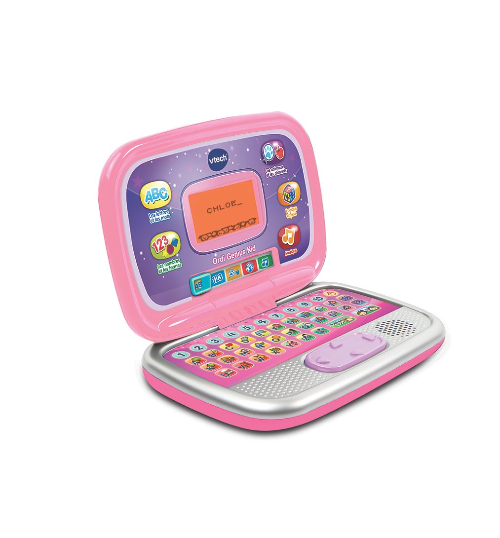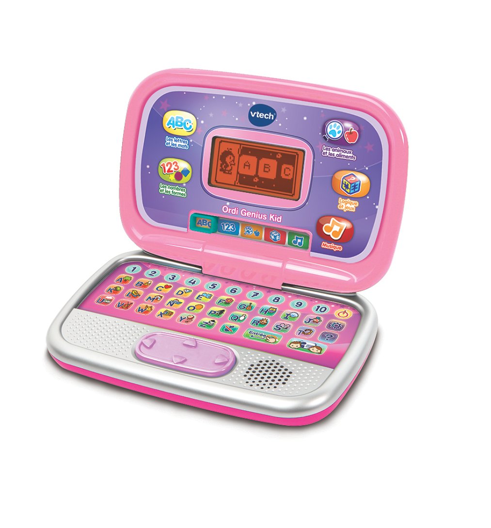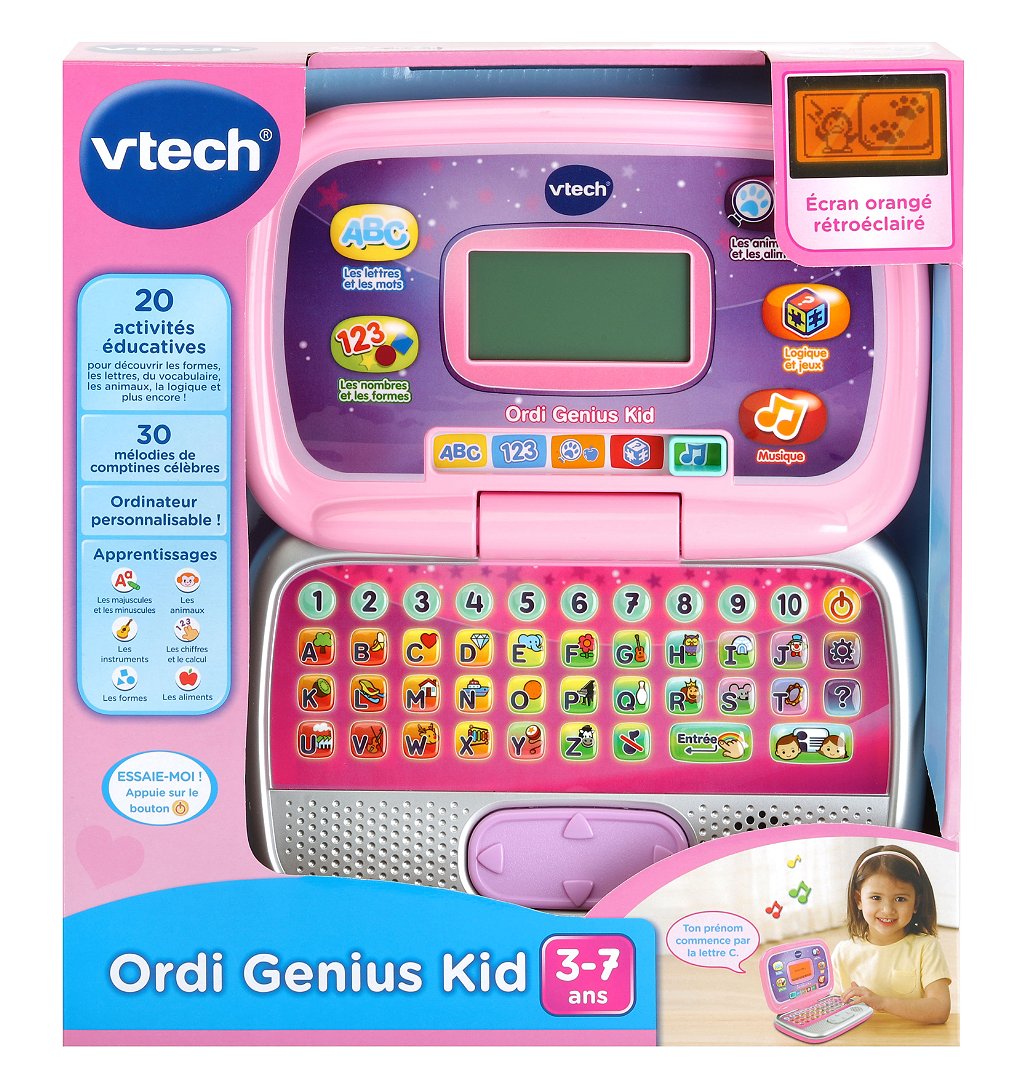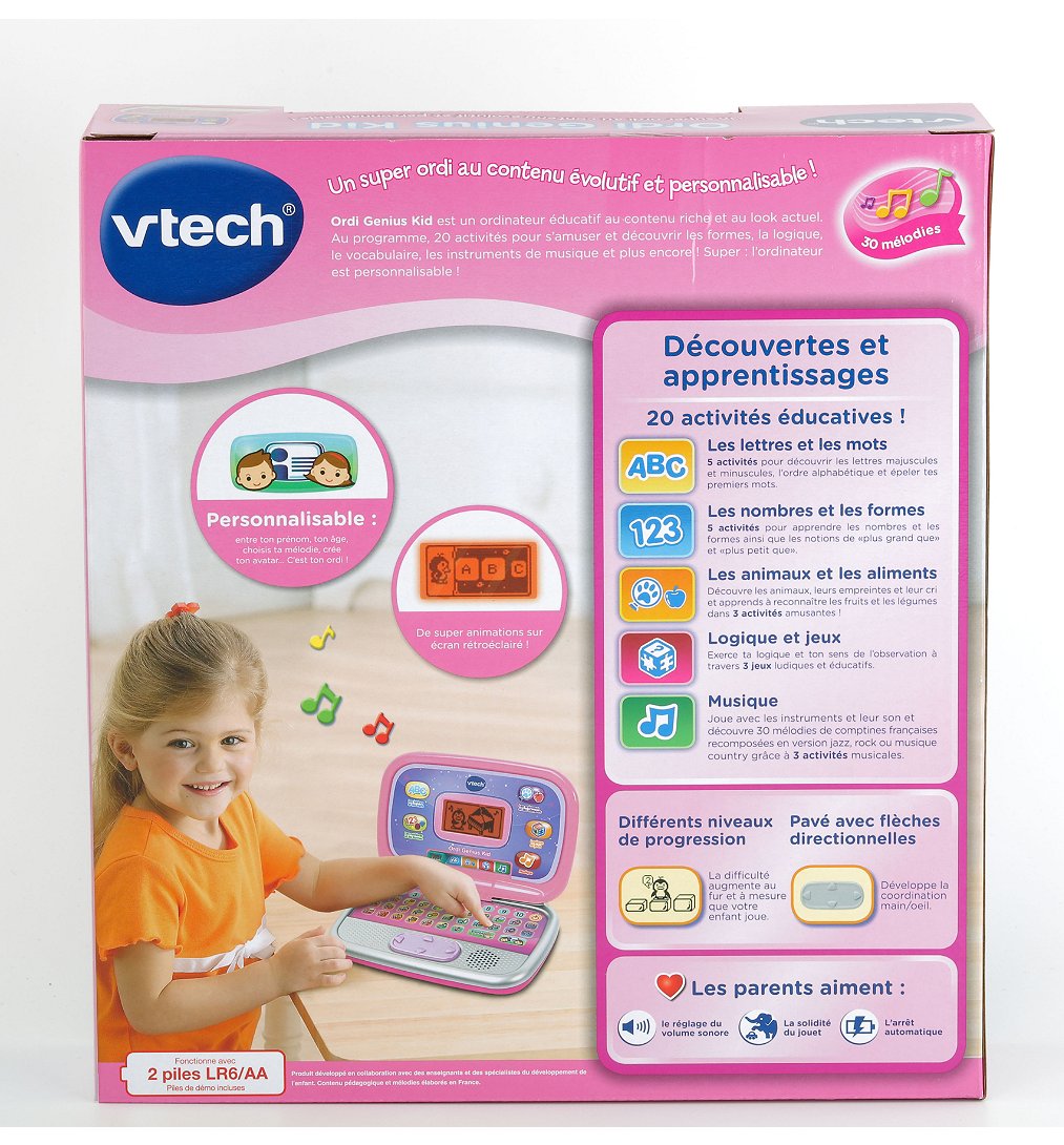 Ordi Genius Kid rose – 3 - 7 ans 20 activités pour découvrir les formes, les animaux, la logique, le vocabulaire et plus encore. L’écran interactif rétro-éclairé affiche des animations amusantes. Personnalisable : prénom, âge, mélodie, avatar et aliments préférés de l’enfant. 30 mélodies et différents modes musicaux : rock, jazz et country. Avec clavier abécédaire, 10 touches Chiffre, un pavé directionnel et un sélecteur de mode de jeu. Différents niveaux de progression : plus l’enfant joue, plus la difficulté augmente. Réglage du volume sonore et arrêt automatique. Boîte ouverte. Fonctionne avec 2 piles LR6 fournies.