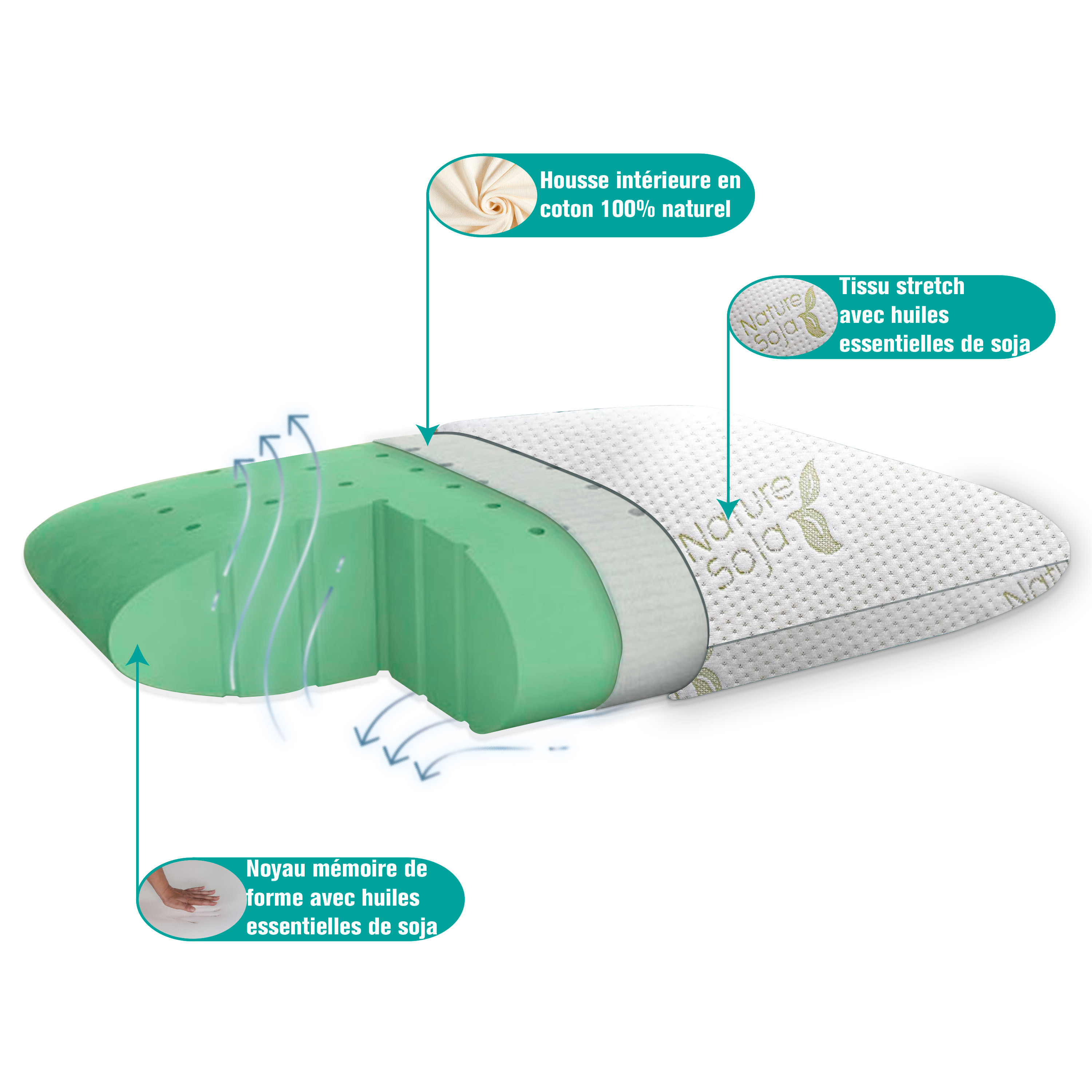 L’oreiller Soja Visco a une structure cellulaire ouverte aux coupes perpendiculaires sur l'âme à mémoire de forme qui permet la libre circulation de l’air, évite l’accumulation d’humidité et facilite la rénovation de l’air à l’intérieur de l’oreiller durant les mouvements réalisés pendant le sommeil.