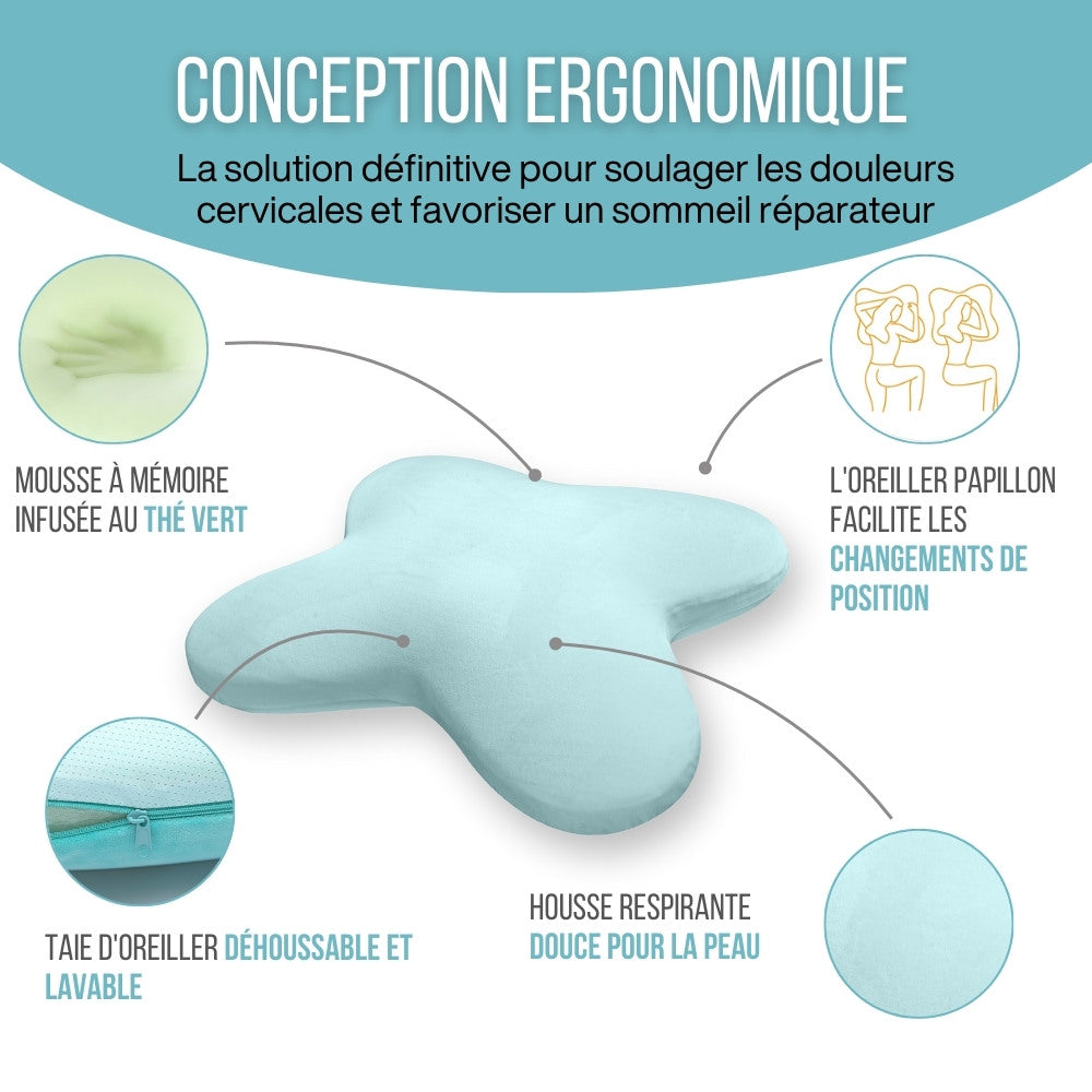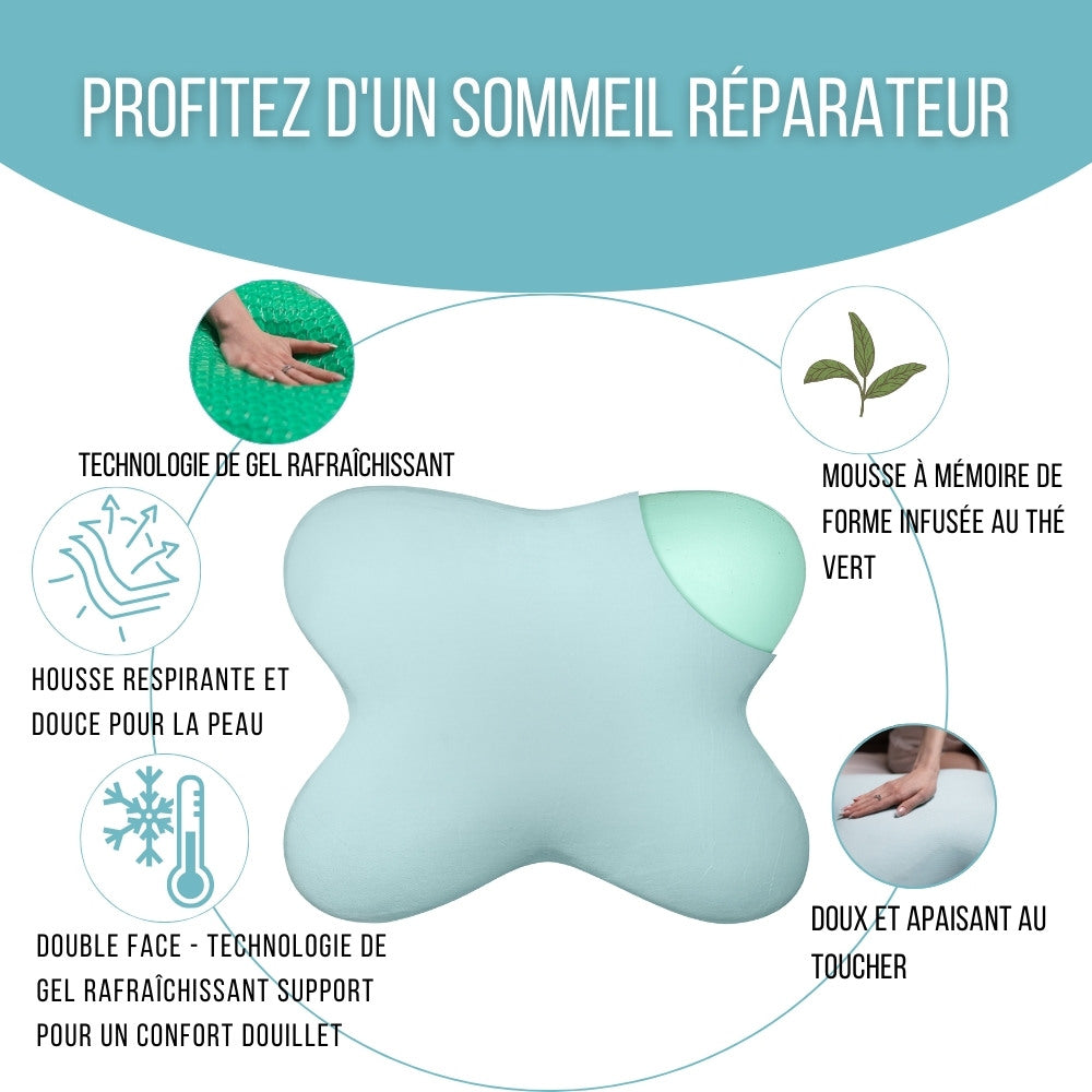 Découvrez l'Oreiller Papillon Rafraîchissant à Mémoire de Forme - la solution idéale pour ceux qui changent fréquemment de position durant la nuit et pour les personnes souffrant de transpiration nocturne.