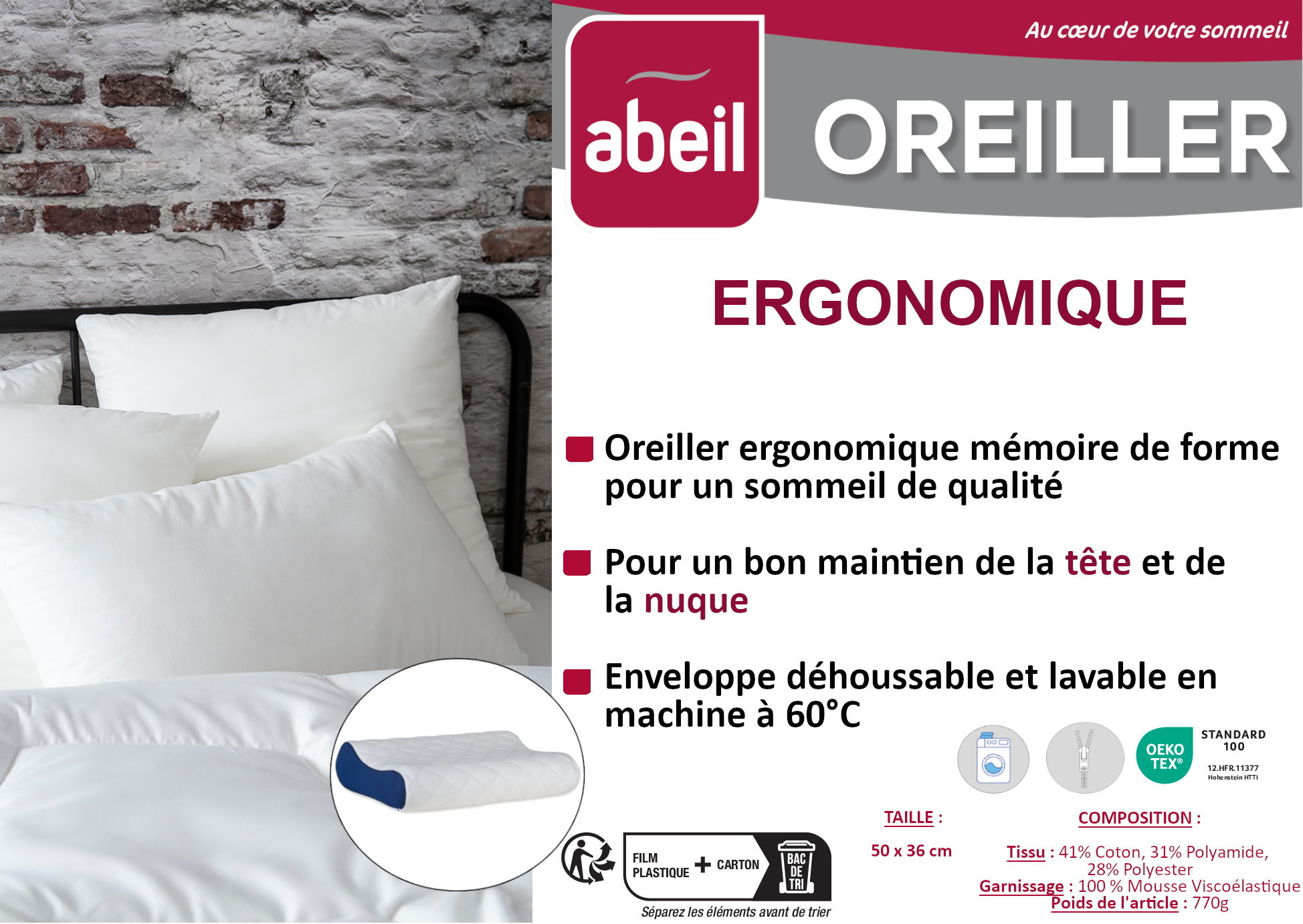 Oreiller ergonomique à mémoire de forme, il épouse parfaitement toutes les morphologies. Enveloppe extérieure 41% coton, 31% polyamide, 28% polyester. Garnissage 100% mousse viscoélastique. Enveloppe douce et amovible, lavable en machine à 60°C.