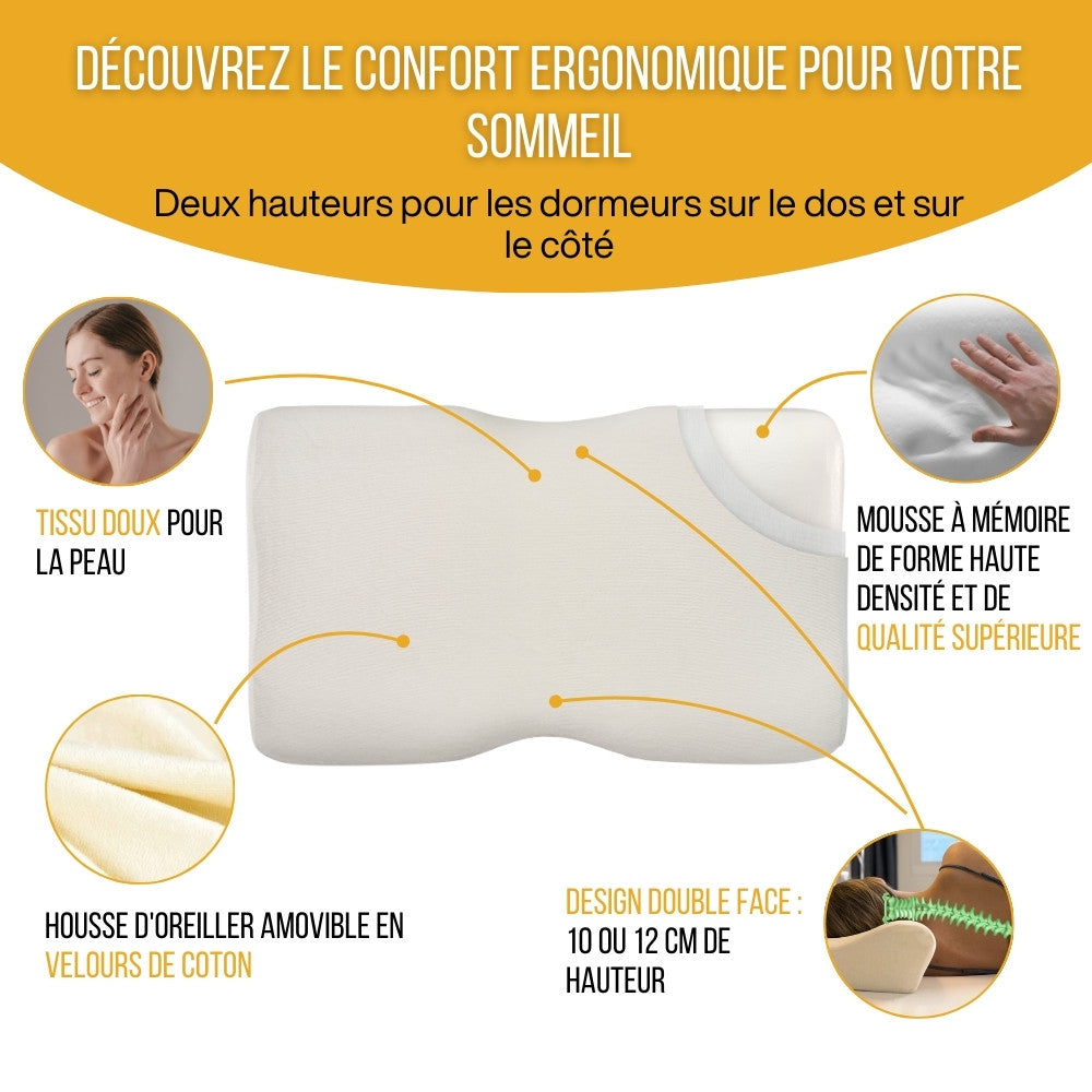 Grâce à l'oreiller ergonomique en mousse à mémoire de forme, votre cou et votre tête reposent confortablement et naturellement sur des côtés surélevés qui s'adaptent à la hauteur de votre épaule afin de maintenir une colonne vertébrale saine. L'oreiller dispose d'une caractéristique spéciale avec deux hauteurs différentes selon que vous dormez sur le côté ou sur le dos. Le profil de la ""cavité latérale"" est flexible afin de vous offrir plus de confort lorsque vous dormez sur le côté, tandis que la partie centrale offre un soutien adapté pour les dormeurs sur le dos.