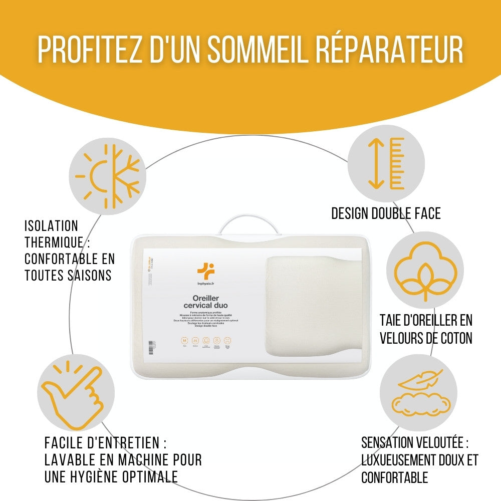 L'oreiller Premium Ergonomique et Cervical Duo de la marque Inphysio assure un positionnement optimal de la tête et soulage la section cervicale de la colonne vertébrale pendant votre sommeil. Grâce à la forme de ses deux côtés, cet oreiller offre deux positions afin de correspondre à vos préférences en matière de hauteur. L'oreiller soulage les maux associés aux douleurs de dos, à l'insomnie, aux ronflements et à la tension nerveuse.