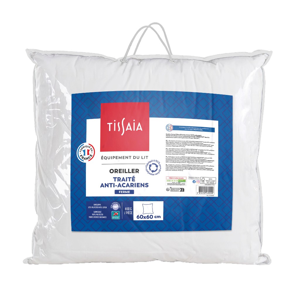 Tissaia oreiller Ferme 60x60cm - Traité anti-acariens - 52% Polyester/48% Coton - Densité 650g/m2