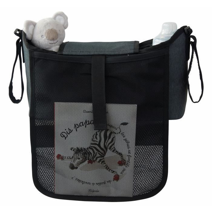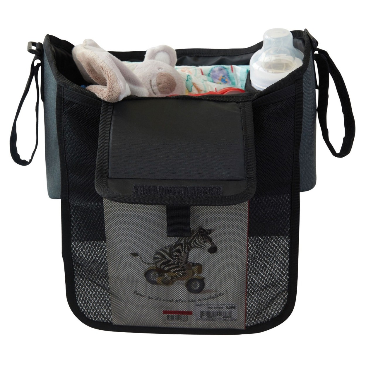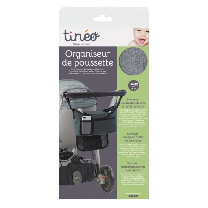 L'organisateur de poussette Tinéo vous offre le nécessaire de bébé à portée de main. Nomade, il est idéal pour emporter les indispensables pendant les promenades sans s'encombrer. Pratique, il dispose de 2 poches avant pour y glisser les affaires des parents. L'organisateur de poussette dispose également de 3 compartiments centraux pour les affaires de bébé ainsi qu'une poche filet au dos. Les fixations sont universelles grâce aux attaches auto-agrippantes.