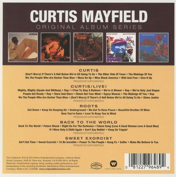 La collection 5 Albums originaux Warner. Retrouvez 5 albums originaux de Curtis Mayfield cet artiste majeur du catalogue Warner dans un coffret à prix spécial. L'occasion rêvée de compléter & d'enrichir sa discothèque sans se ruiner avec un son de qualité ! Chaque album est proposé en format pochette ultra slim, ainsi le coffret prend un minimum de place à ranger.