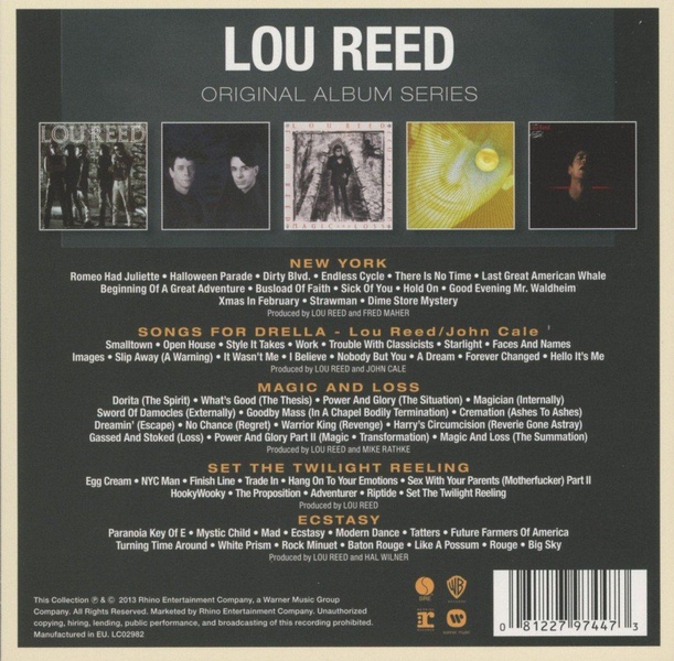 Liste des pistes 5.01 . paranoia key of e - Reed, Lou5.02 . mystic child - Reed, Lou5.03 . mad - Reed, Lou5.04 . ecstasy - Reed, Lou5.05 . modern dance - Reed, Lou5.06 . tatters - Reed, Lou5.07 . future farmers of america - Reed, Lou5.08 . turning time around - Reed, Lou5.09 . white prism - Reed, Lou5.10 . rock minuet - Reed, Lou5.11 . baton rouge - Reed, Lou5.12 . like a possum - Reed, Lou5.13 . rouge - Reed, Lou5.14 . big sky - Reed, Lou4.01 . egg cream - Reed, Lou4.02 . nyc man - Reed, Lou4.03 . finish line - Reed, Lou4.04 . trade in - Reed, Lou4.05 . hang on to your emotions - Reed, Lou4.06 . sex with you parents motherfucker - part ii - Reed, Lou4.07 . hooky wooky - Reed, Lou4.08 . the proposition - Reed, Lou4.09 . adventurer - Reed, Lou4.10 . riptide - Reed, Lou4.11 . set the twilight reeling - Reed, Lou3.01 . dorita - Reed, Lou3.02 . what's good - Reed, Lou3.03 . power and glory - Reed, Lou3.04 . magician - Reed, Lou3.05 . sword of damocles - Reed, Lou3.06 . goodby mass - Reed, Lou3.07 . cremation - Reed, Lou3.08 . dreamin' - Reed, Lou3.09 . no chance - Reed, Lou3.10 . warrior king - Reed, Lou3.11 . harry's circumcision - Reed, Lou3.12 . gassed ans stoked - Reed, Lou3.13 . power and glory - part ii - Reed, Lou3.14 . magic and loss - Reed, Lou2.01 . smalltown (lou reed, john cale) - Reed, Lou2.02 . open house (lou reed, john cale) - Reed, Lou2.03 . style it takes (lou reed, john cale) - Reed, Lou2.04 . work (lou reed, john cale) - Reed, Lou2.05 . trouble with classicists (lou reed, john cale) - Reed, Lou2.06 . starlight (lou reed, john cale) - Reed, Lou2.07 . faces and names (lou reed, john cale) - Reed, Lou2.08 . images (lou reed, john cale) - Reed, Lou2.09 . slip away (lou reed, john cale) - Reed, Lou2.10 . it wasn't me (lou reed, john cale) - Reed, Lou2.11 . i believe (lou reed, john cale) - Reed, Lou2.12 . nobody but you (lou reed, john cale) - Reed, Lou2.13 . a dream (lou reed, john cale) - Reed, Lou2.14 . forever changed (lou reed, john cale) - Reed, Lou2.15 . hello it's me (lou reed, john cale) - Reed, Lou1.01 . romeo had juliette - Reed, Lou1.02 . halloween parade - Reed, Lou1.03 . dirty boulevard - Reed, Lou1.04 . endless cycle - Reed, Lou1.05 . there is no time - Reed, Lou1.06 . last great american whale - Reed, Lou1.07 . beginning of a great adventure - Reed, Lou1.08 . busload of faith - Reed, Lou1.09 . sick of you - Reed, Lou1.10 . hold on - Reed, Lou1.11 . good evening mr waldheim - Reed, Lou1.12 . xmas in february - Reed, Lou1.13 . strawman - Reed, Lou1.14 . dime store mystery - Reed, Lou