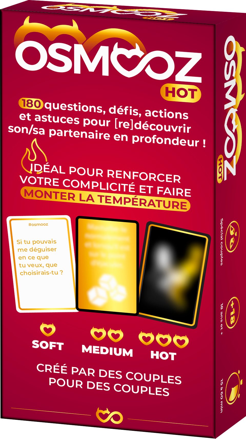 180 cartes pour faire monter la température Ce jeu d'ambiance pour adultes est spécialement créé pour les couples souhaitant pimenter leur relation. Osmooz Hot propose 180 cartes réparties en 3 niveaux d'intensité et 8 catégories variées, offrant une expérience de jeu riche et diversifiée. Les joueurs peuvent s'attendre à des questions intimes, des défis sensuels et des actions audacieuses. Un concept simple et excitant Le concept d'Osmooz Hot est ingénieux dans sa simplicité : les joueurs piochent une carte à tour de rôle et exécutent l'action indiquée. Les cartes sont classées par niveau de "chaleur", permettant aux couples de progresser à leur rythme, des questions légères aux défis plus osés. L'expérience de jeu promet d'être intense et émotionnelle. Les participants ressentiront un mélange d'excitation, de curiosité et peut-être même une pointe d'appréhension face aux cartes les plus audacieuses. Ce jeu crée une atmosphère intime propice au rapprochement et à la découverte mutuelle. Osmooz Hot est le compagnon idéal pour une soirée en tête-à-tête pleine de surprises et de sensations fortes.