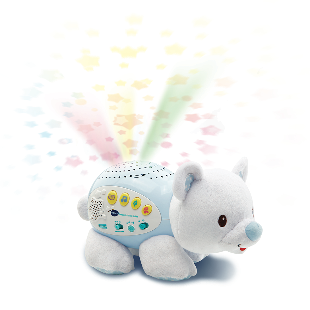 Ourson dodo nuit étoilée - 0 - 6 ans Une veilleuse musicale avec variations de couleurs et capteur sonore : 4 modes : - Histoires - Berceuses et mélodies - Sons de la nature - Sons de la nature + berceuses Projection étoilée avec variations de couleurs (rouge, jaune, vert et bleu). Lorsque Bébé se réveille et pleure, un capteur sonore déclenche automatiquement des mélodies douces. Minuterie de 15, 30 et 45 min. Contenu très riche : 7 histoires, 12 sons de la nature, 60 mélodies et 3 berceuses. Possibilité de désactiver la projection lumineuse pour profiter uniquement des différents sons. Réglage du volume sonore et arrêt automatique. Boîte Try-me. Fonctionne avec 2 piles LR6 fournies.