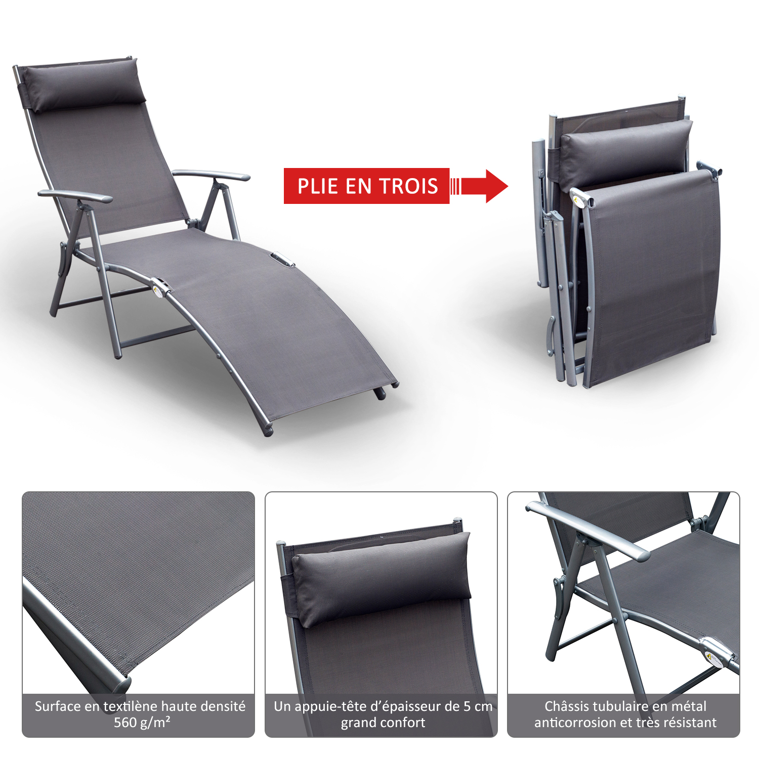 - Dossier réglable multi-positions, 5 positions au choix suivant votre besoin : lecture, sieste, bain de soleil, etc...