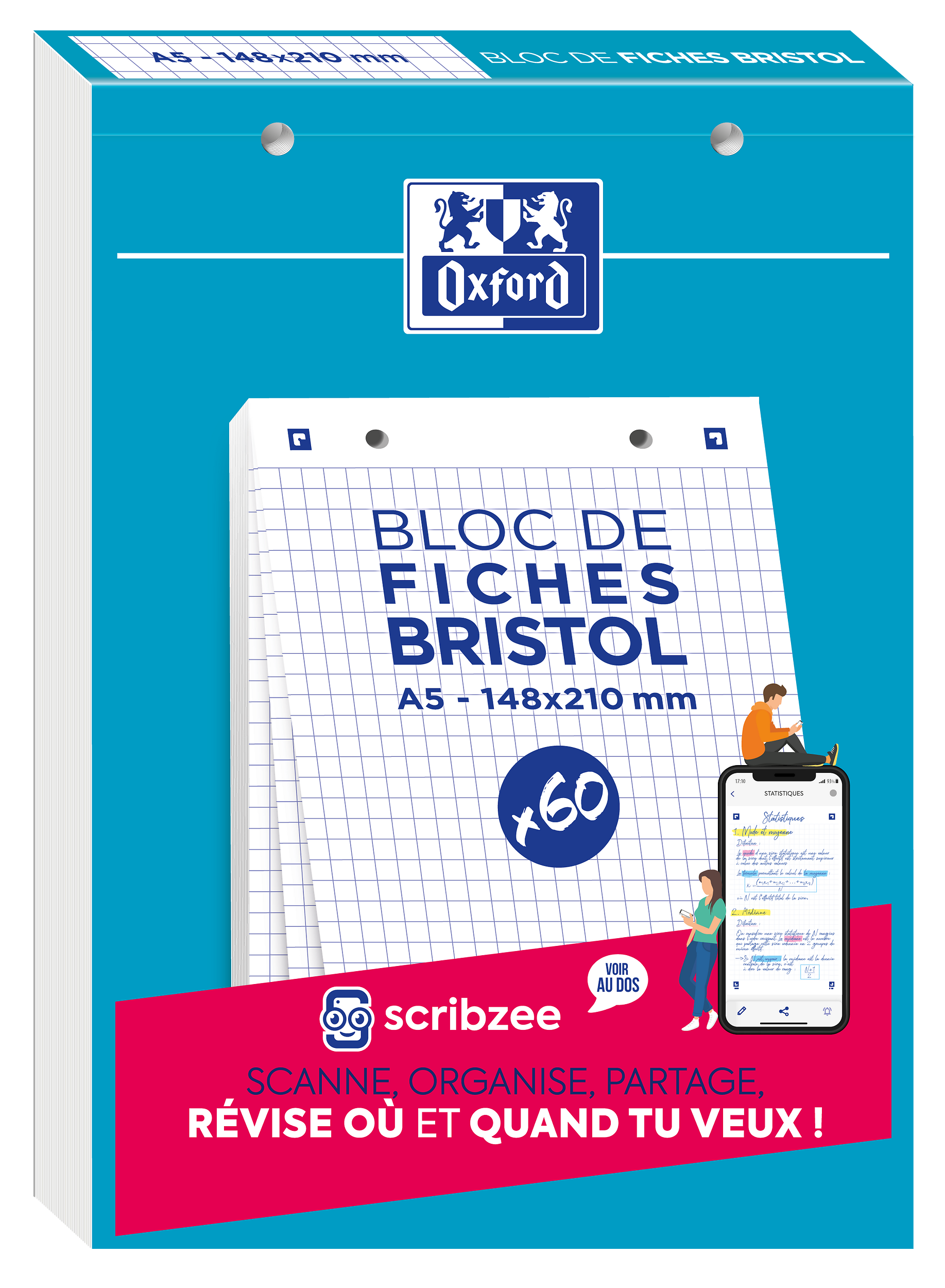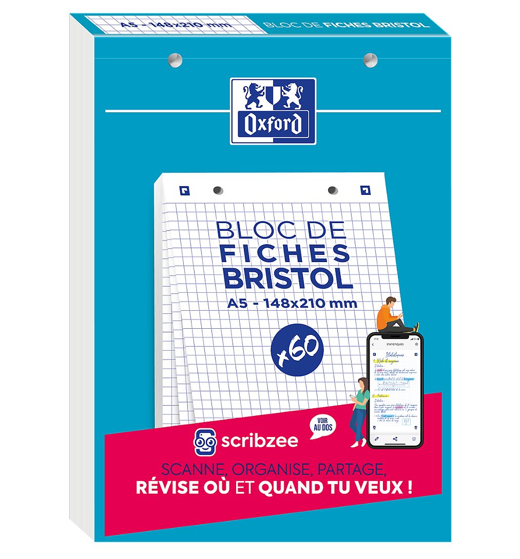 Pratique et facile à transporter, le bloc de fiches Bristol Oxford est indispensable pour préparer sereinement vos examens en révisant où et quand vous voulez ! Profitez du temps passé dans les transports ou pendant vos pauses pour réviser et être au top au moment des examens. Vous avez oublié vos fiches à la maison? Vous n'avez pas envie d'avoir à les transporter ni de prendre le risque de les perdre ? Pas de stress, avec l’application Scribzee® vos fiches sont sauvegardées dans le cloud gratuitement. Elles sont disponibles à tout moment pour réviser partout et depuis tous vos appareils connectés. Et grâce à Scribzee® vous pourrez même suivre l’avancement de vos révisions au jour le jour ! En carte 210g de haute qualité et résistante, les fiches bristol OXFORD sont lisses et opaques pour le confort de l'écriture, rigides pour le classement et la tenue dans le temps. Protégées par une couverture enveloppante et résistante, elles sont pratiques à transporter tout en étant facilement détachables. Ces fiches sont au format A5 (14, 8cm x 21cm). Elles sont perforées 2 trous pour faciliter leur rangement dans un classeur et les transporter partout avec soi. Leur réglure petits carreaux 5x5mm (aussi appelée "réglure quadrillée 5mm") permet une prise de notes structurée.