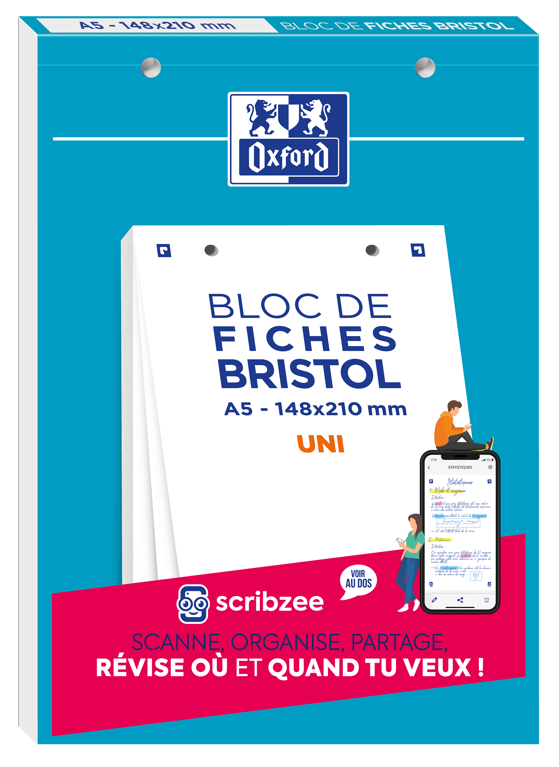 Pratique et facile à transporter, le bloc de fiches Bristol Oxford est indispensable pour préparer sereinement vos examens en révisant où et quand vous voulez ! Profitez du temps passé dans les transports ou pendant vos pauses pour réviser et être au top au moment des examens. Vous avez oublié vos fiches à la maison? Vous n'avez pas envie d'avoir à les transporter ni de prendre le risque de les perdre ? Pas de stress, avec l’application Scribzee® vos fiches sont sauvegardées dans le cloud gratuitement. Elles sont disponibles à tout moment pour réviser partout et depuis tous vos appareils connectés. Et grâce à Scribzee® vous pourrez même suivre l’avancement de vos révisions au jour le jour ! En carte 210g de haute qualité et résistante, les fiches bristol OXFORD sont lisses et opaques pour le confort de l'écriture, rigides pour le classement et la tenue dans le temps. Protégées par une couverture enveloppante et résistante, elles sont pratiques à transporter tout en étant facilement détachables. Ces fiches sont au format A5 (14, 8cm x 21cm). Elles sont perforées 2 trous pour faciliter leur rangement dans un classeur et les transporter partout avec soi. Leur réglure blanche unie permet une prise de notes personnalisée et la possibilité de dessiner des croquis ou des schémas.