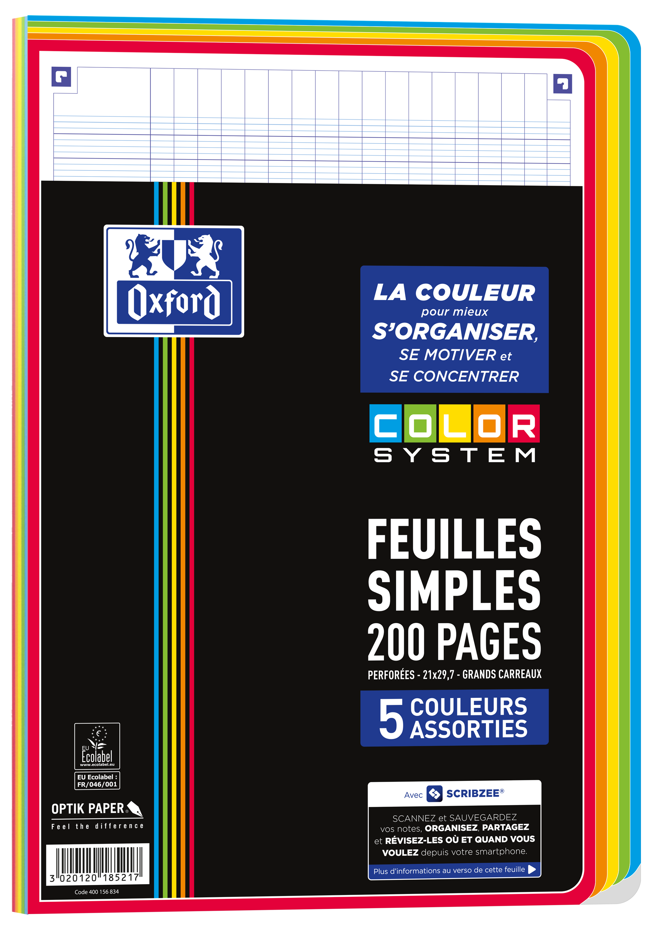Vous cherchez à apprendre plus efficacement ? Vous avez besoin d'outils et de méthodes pour améliorer votre organisation, vous motiver et faciliter votre concentration ? Oxford vous propose sa solution COLOR SYSTEM. Grâce à ses cadres de couleur qui vont faciliter votre organisation et la rendre plus efficace, vous boosterez aussi votre motivation et stimulerez votre concentration et donc votre mémorisation ! Avec 5 cadres de couleurs différentes (bleu, vert, jaune, orange et rouge) les feuilles simples COLOR SYSTEM vous offrent tous les pouvoirs de la couleur pour apprendre et vous organiser plus facilement ! Et grâce à l'application mobile gratuite SCRIBZEE®, vous pourrez scanner, sauvegarder et consulter vos notes partout et à tout moment ! SCRIBZEE® les classera automatiquement par dossier de couleur et vous permettra de rechercher des mots-clés dans vos pages manuscrites. COLOR SYSTEM, c'est aussi un papier que l'encre ne traverse pas, d'une blancheur parfaite et au toucher extra-lisse. Autant d'éléments obtenus grâce à la qualité Optik Paper pour un confort d'écriture inégalable. Les feuilles simples COLOR SYSTEM sont disponibles en packs de 200 pages A4 avec 5 cadres de couleurs différentes et une réglure à grands carreaux Seyès, en 2 couleurs, qui assure une meilleure lisibilité. Cette réglure Seyès en 2 couleurs a été développée en partenariat avec les ophtalmologistes et permet de réduire l'effet de la fatigue visuelle, tout en améliorant la concentration.