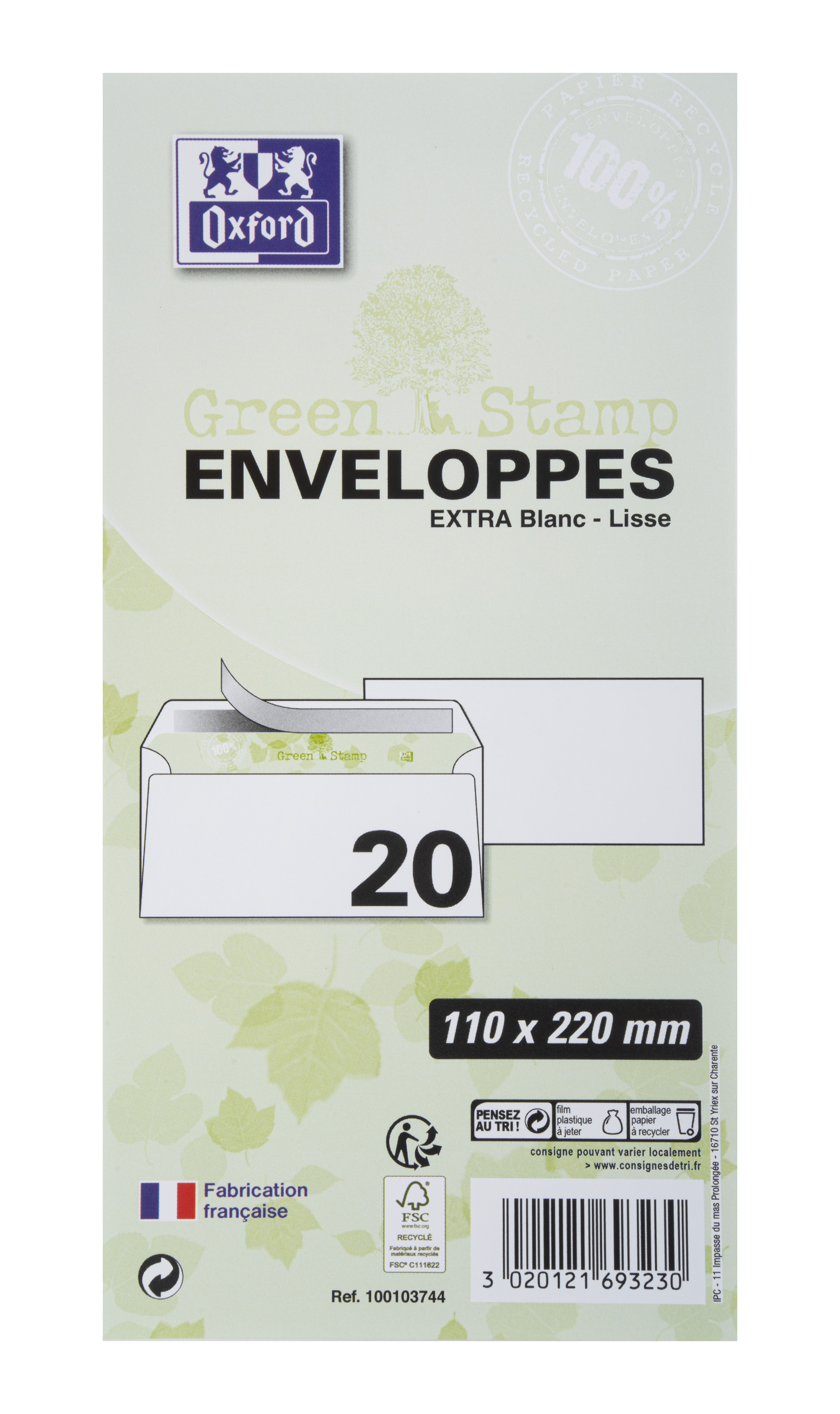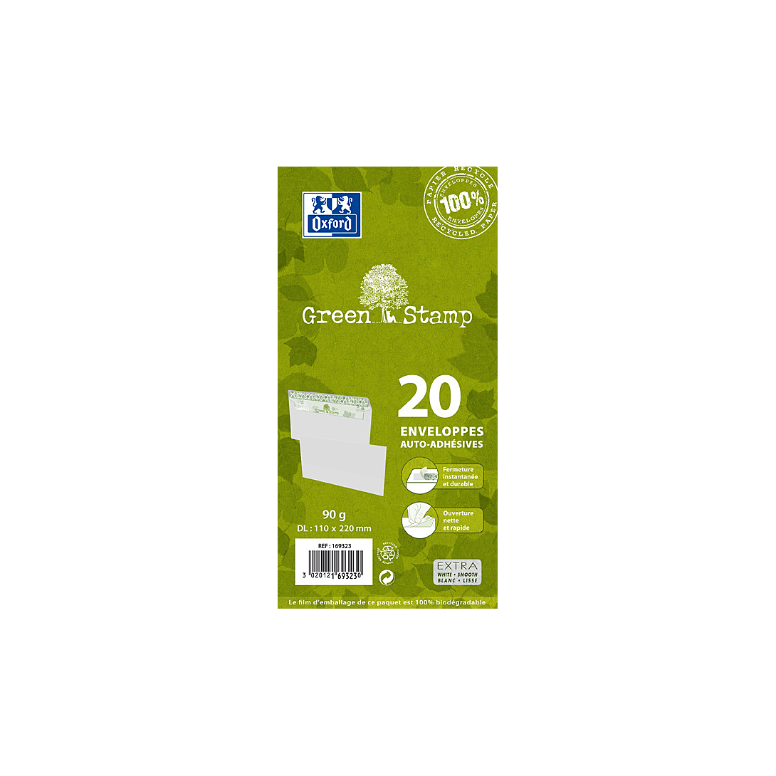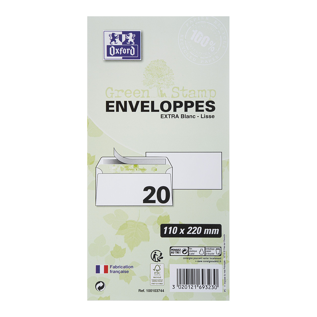| Libellé | OXFORD Lot de 20 Enveloppes Auto-Adhésives Greenstamp 11x22cm Papier Recyclé 90g Blanc |