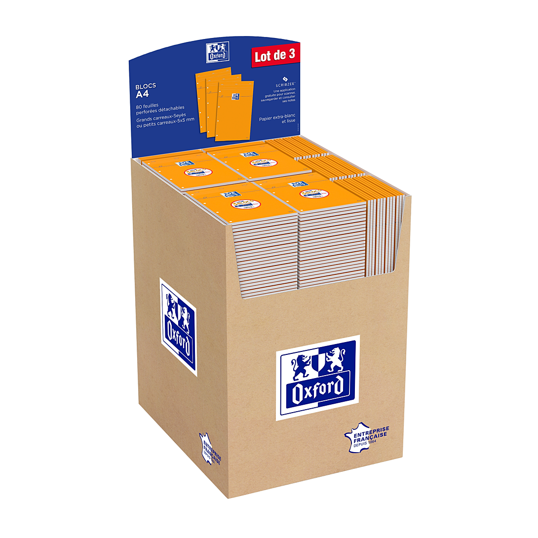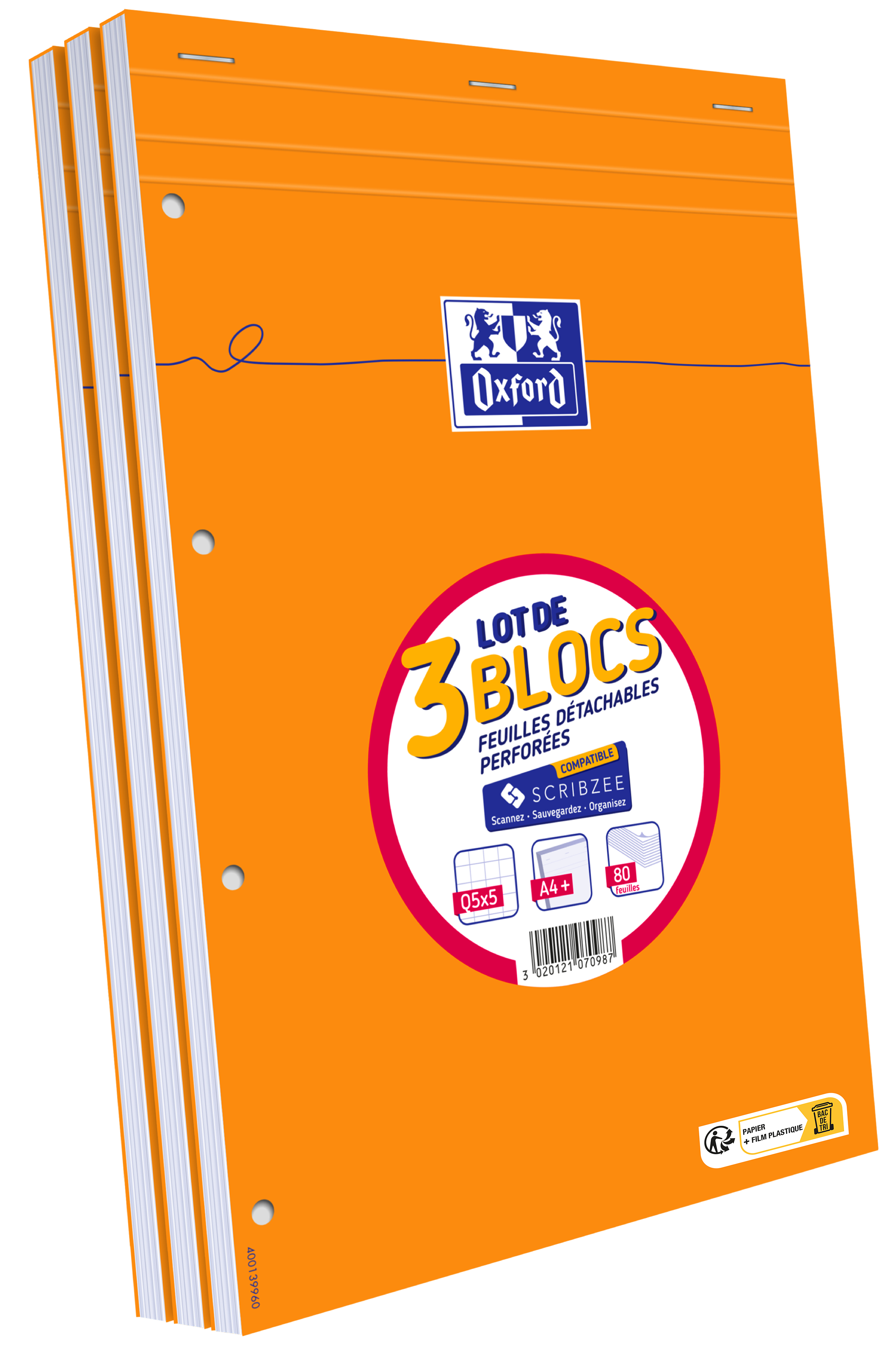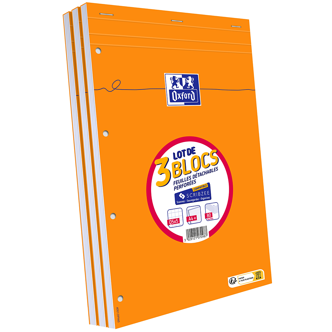 OXFORD - Bloc-notes, A4, 160 pages perforées - Quadrillé 5x5 - Lot de 3 La gamme polyvalente de Blocs-Notes Orange Oxford comprend un large choix de formats (de A7 à A4 +) et de reliures (agrafée côté, dessus ou reliure intégrale), qui la rend idéale pour de nombreuses utilisations : à la maison, à l'école, en entreprise ou pour son organisation personnelle. Disponibles en format A4+ avec reliure agraphée supérieure, les Blocs-Notes oranges Oxford sont parfaits pour un classemement facile et rapide de ses notes. Sa couverture en carte enduite avec grain résiste aux rayures et sa semelle extra rigide est parfaite pour écrire debout même sans support.. COUVERTURE : La couverture en carte enduite et imperméable est très résistance aux déchirures. Elle ne se raye pas grâce à son grain.