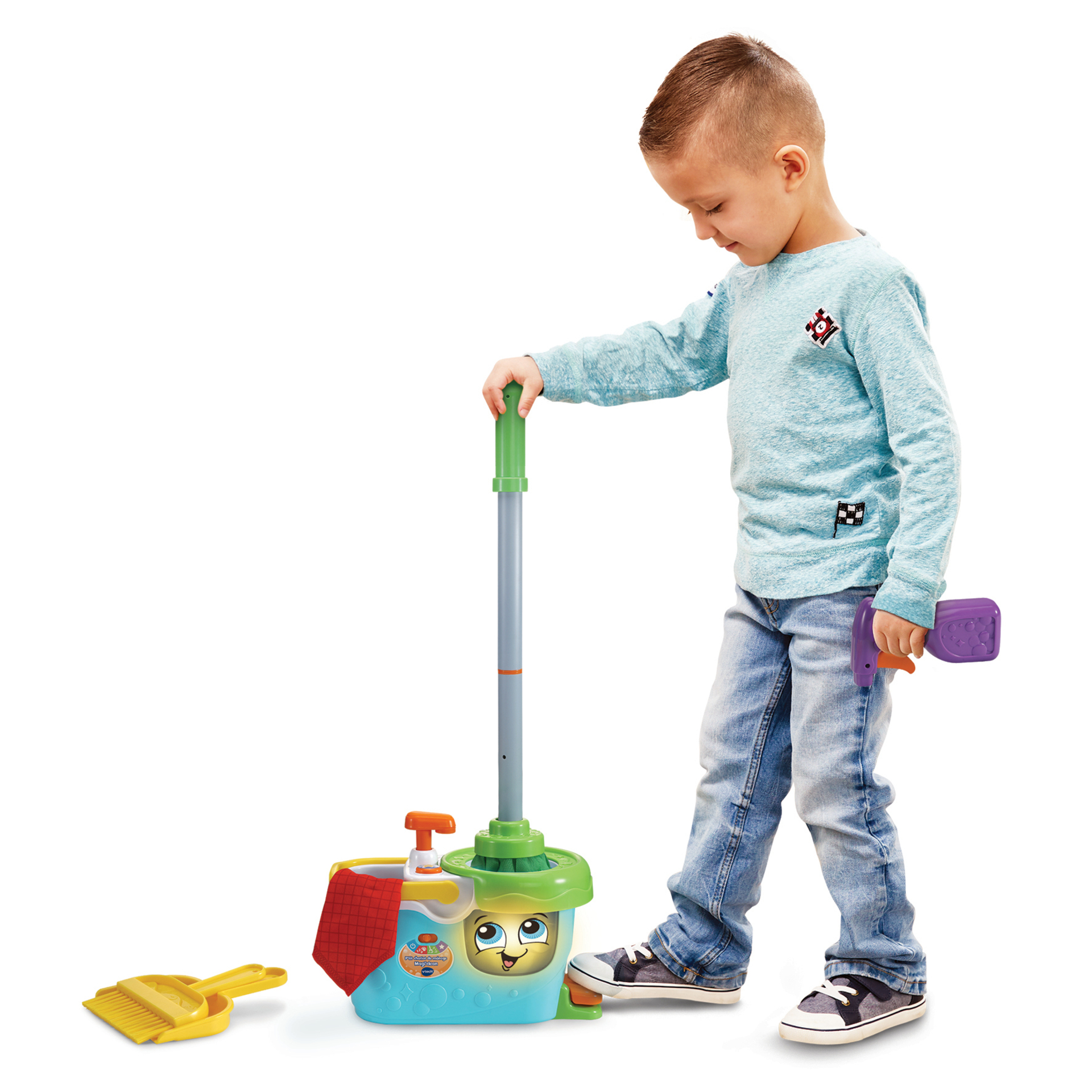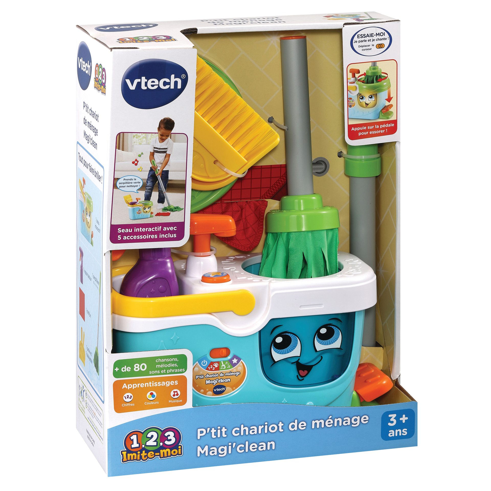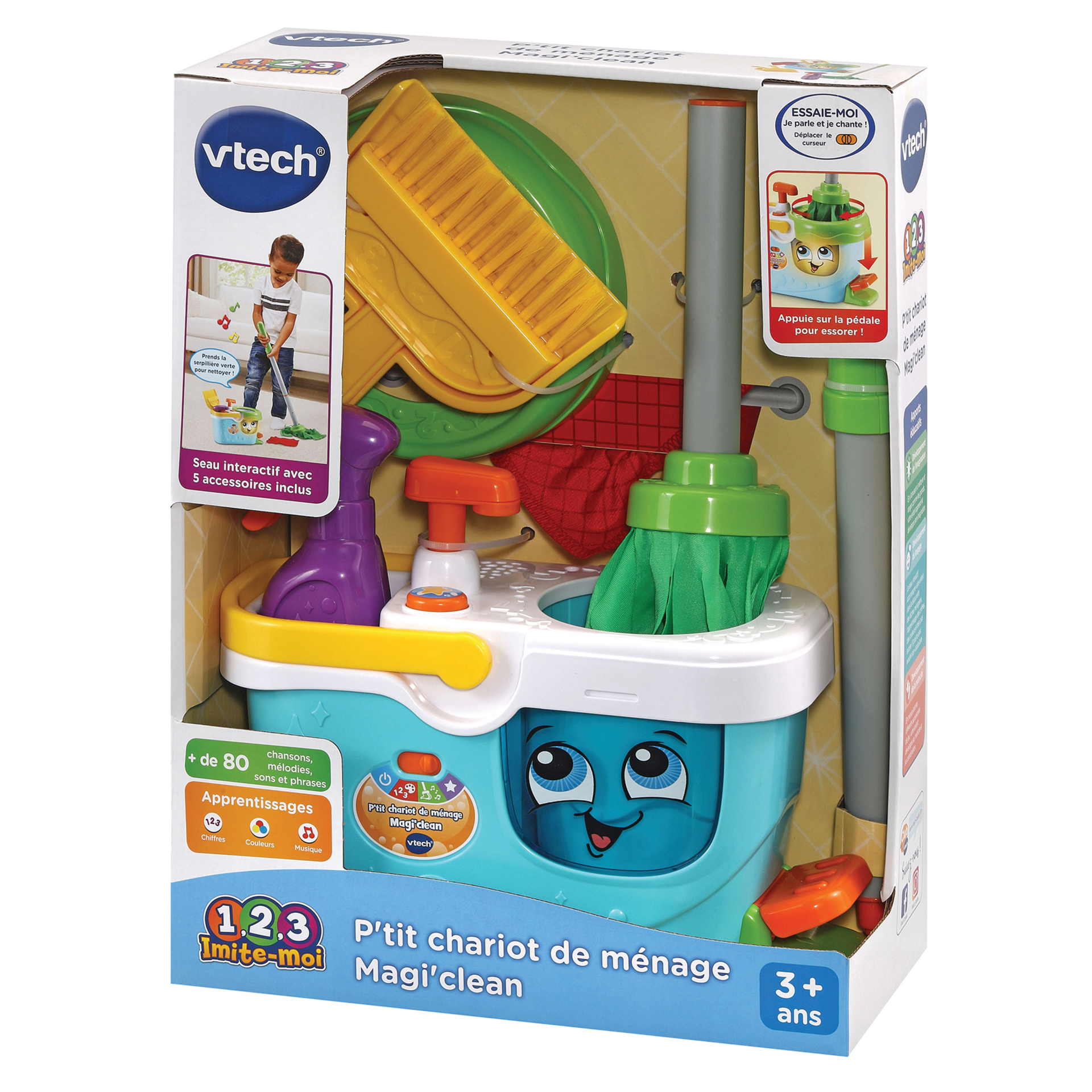 P'tit chariot de ménage Magi'clean - 3 ans + Un chariot musical plein d’accessoires pour nettoyer la maison du sol au plafond ! • En appuyant sur la pédale, l’enfant déclenche des effets sonores (bruits d’eau, airs de musique, phrases rigolotes) et enclenche un mécanisme d’essorage du balai. Il apprend également à compter. • Le visage du seau s’illumine lorsqu’il parle, ou en mode essorage. • Le distributeur de savon apprend à l’enfant à compter. • Tous les accessoires peuvent être rangés dans le chariot. • 3 modes : apprentissage, jeu, imitation. • Contenu : un chariot de ménage électronique, une serpillière, une pelle et une balayette, un flacon pulvérisateur et un chiffon. • Arrêt automatique. Boîte Try-me. Fonctionne avec 2 piles LR6 fournies.