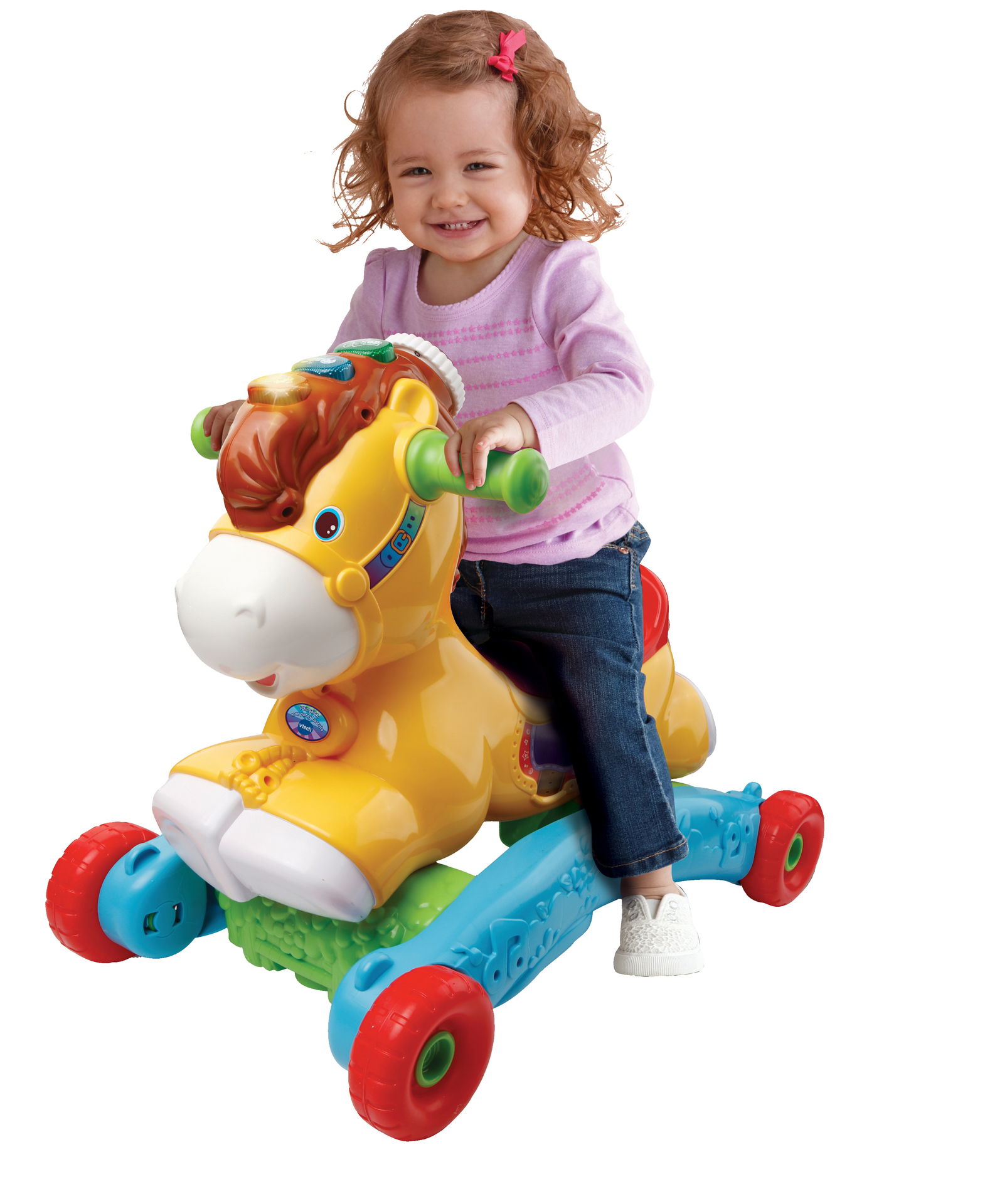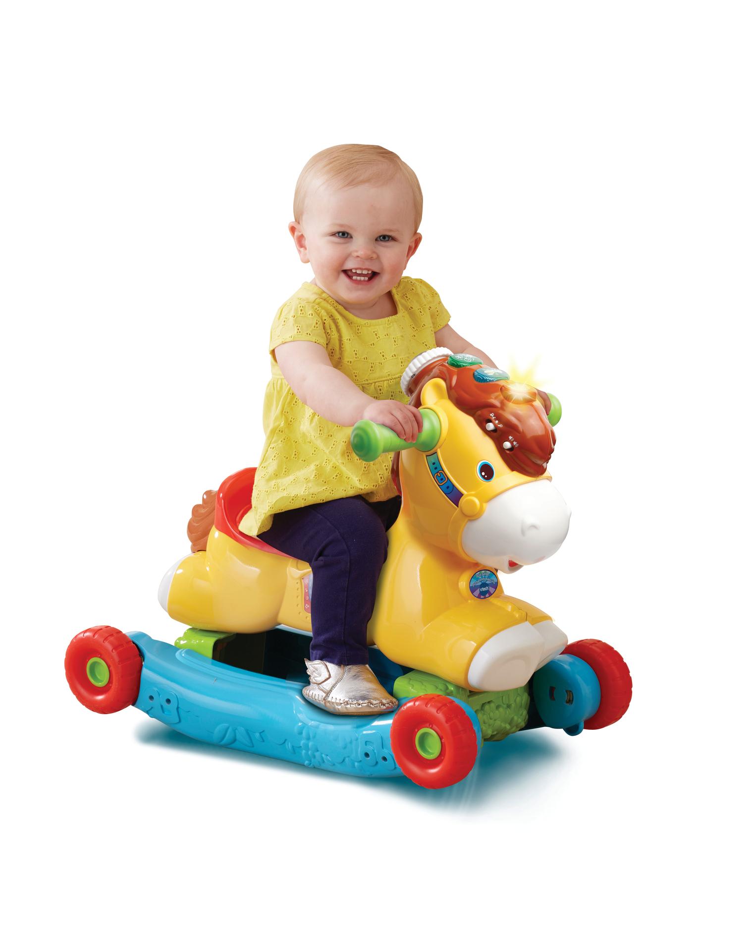 P'tit galop, mon poney basculo - 12 - 36 mois 2 en 1 : cheval à bascule et porteur ! Evolutif : l'enfant utilise d'abord le poney en bascule et se balance. Transformation facile en porteur avec des roues. Avec détecteur de mouvement pour déclencher des sons réalistes de poney ou des mélodies lorsque l'enfant se bascule ou avance. Un tableau d'activités ultra complet avec 3 boutons lumineux pour découvrir les couleurs, les animaux et partir à la découverte de nouveaux lieux et un disque avec des billes colorées. 2 modes de jeu : Découvertes et Musique. 15 mélodies et 5 chansons. Réglage du volume sonore. Boîte try-me. Fonctionne avec 2 piles LR03 fournies.