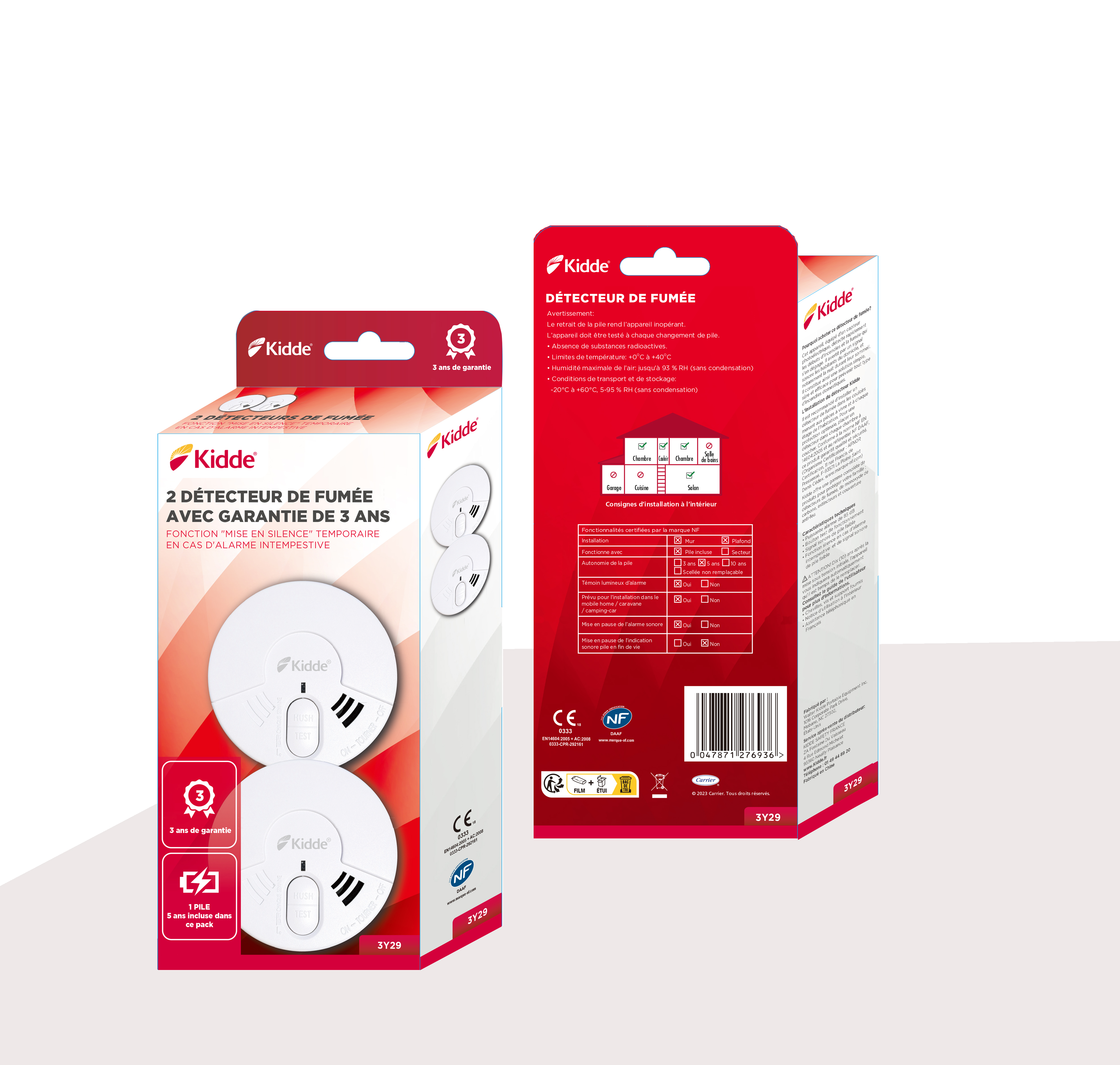 | Libellé | Pack 2 détecteurs de fumée 3Y29 + 1 monoxyde de carbone - Kidde |